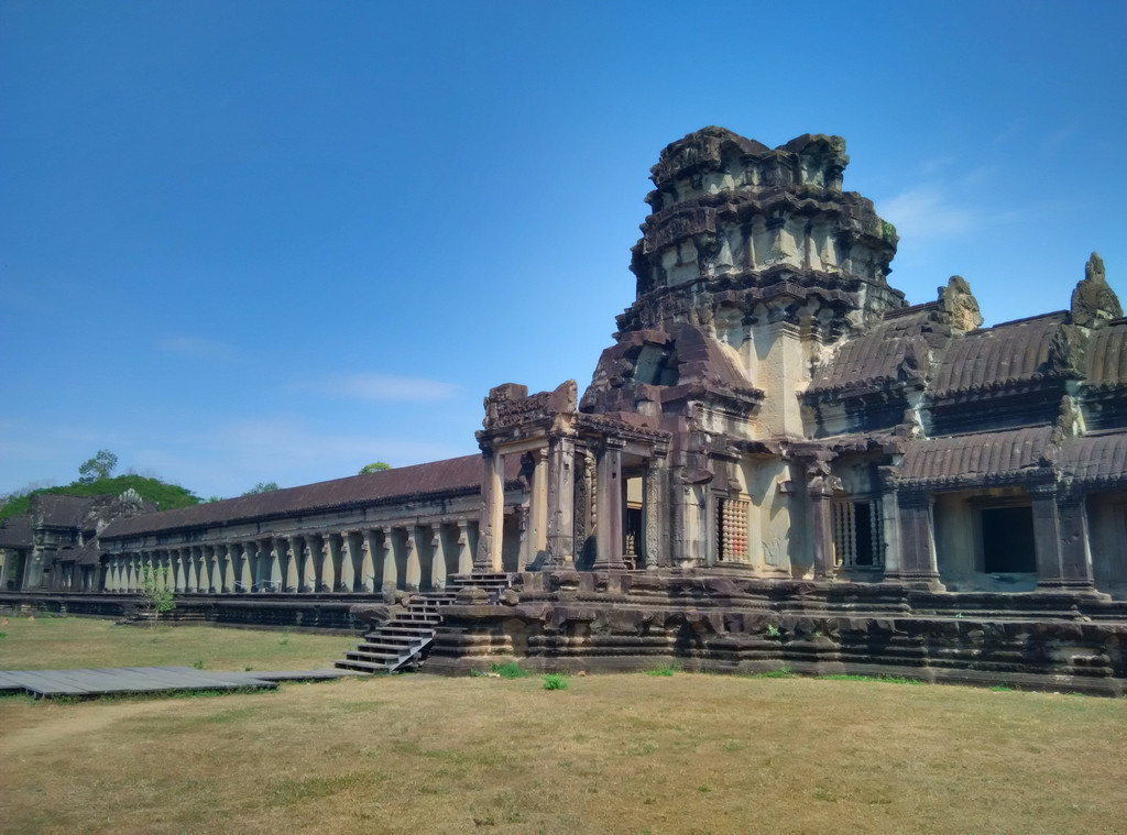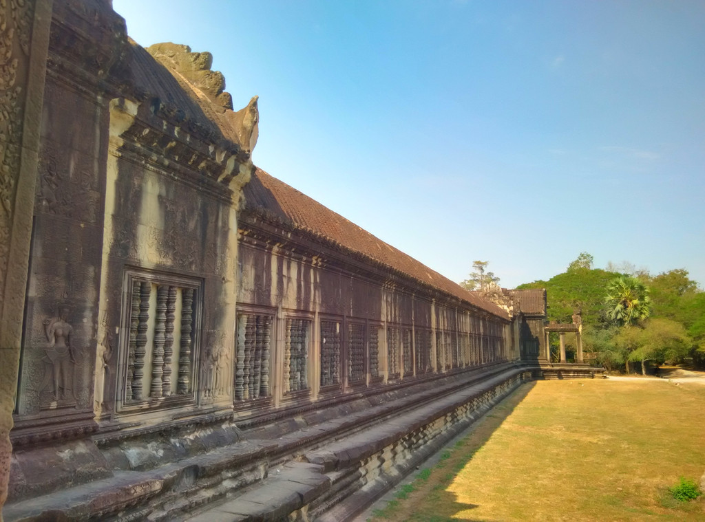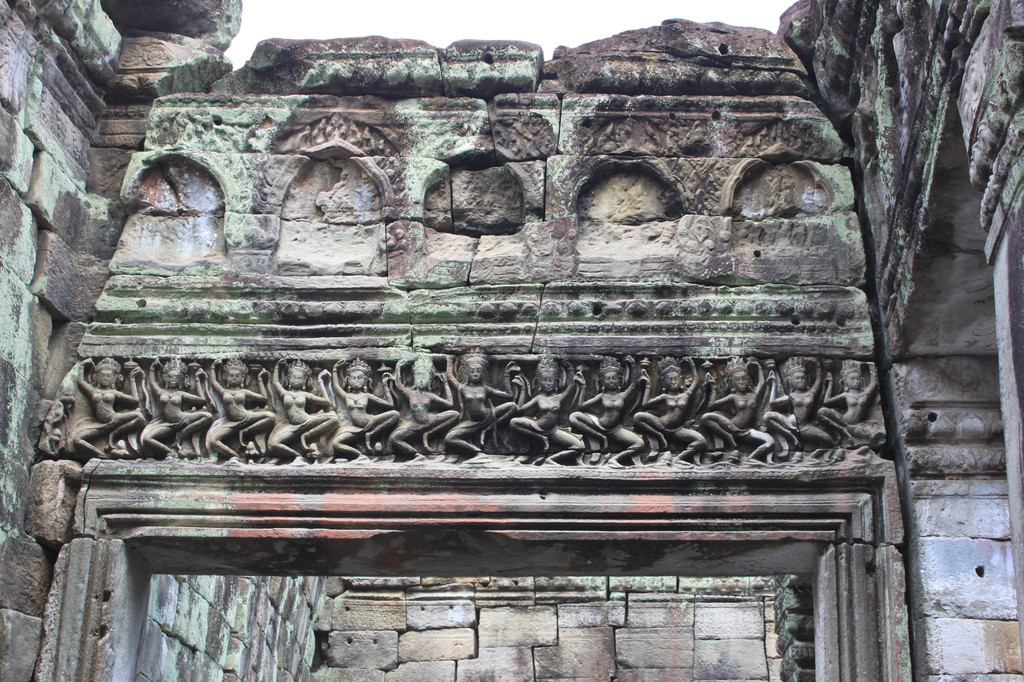 寺内通向中央圣堂的道路由拱顶长廊组成,长廊两侧以粗大的四方石柱支撑,一路上一扇扇石门边上装饰着诸神的雕像,墙上装点着无数的跳舞女神Apsara,姿态曼妙。