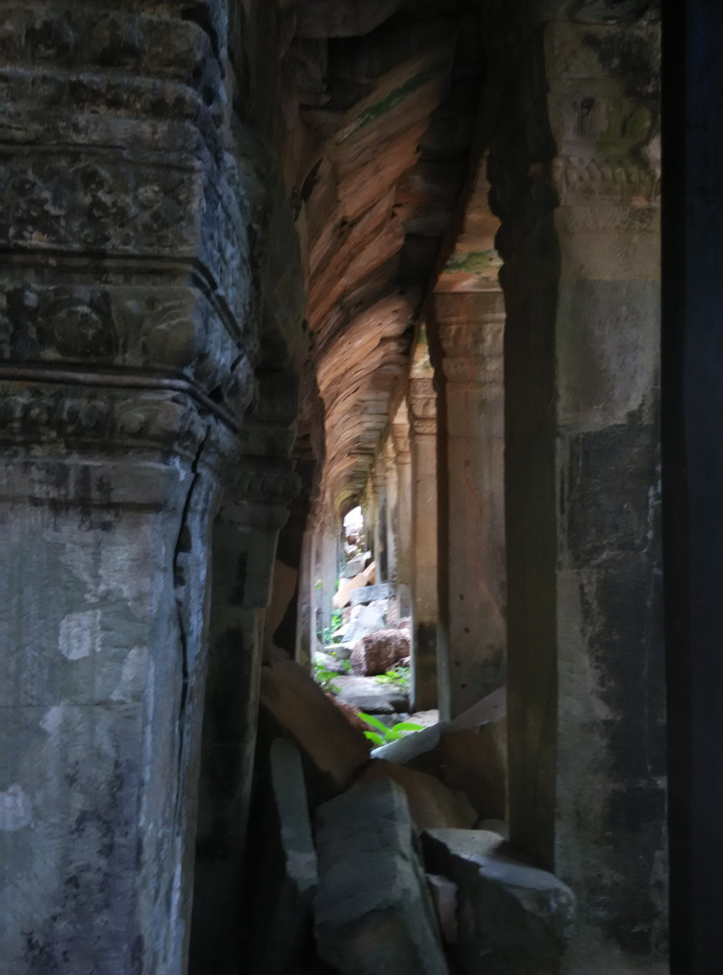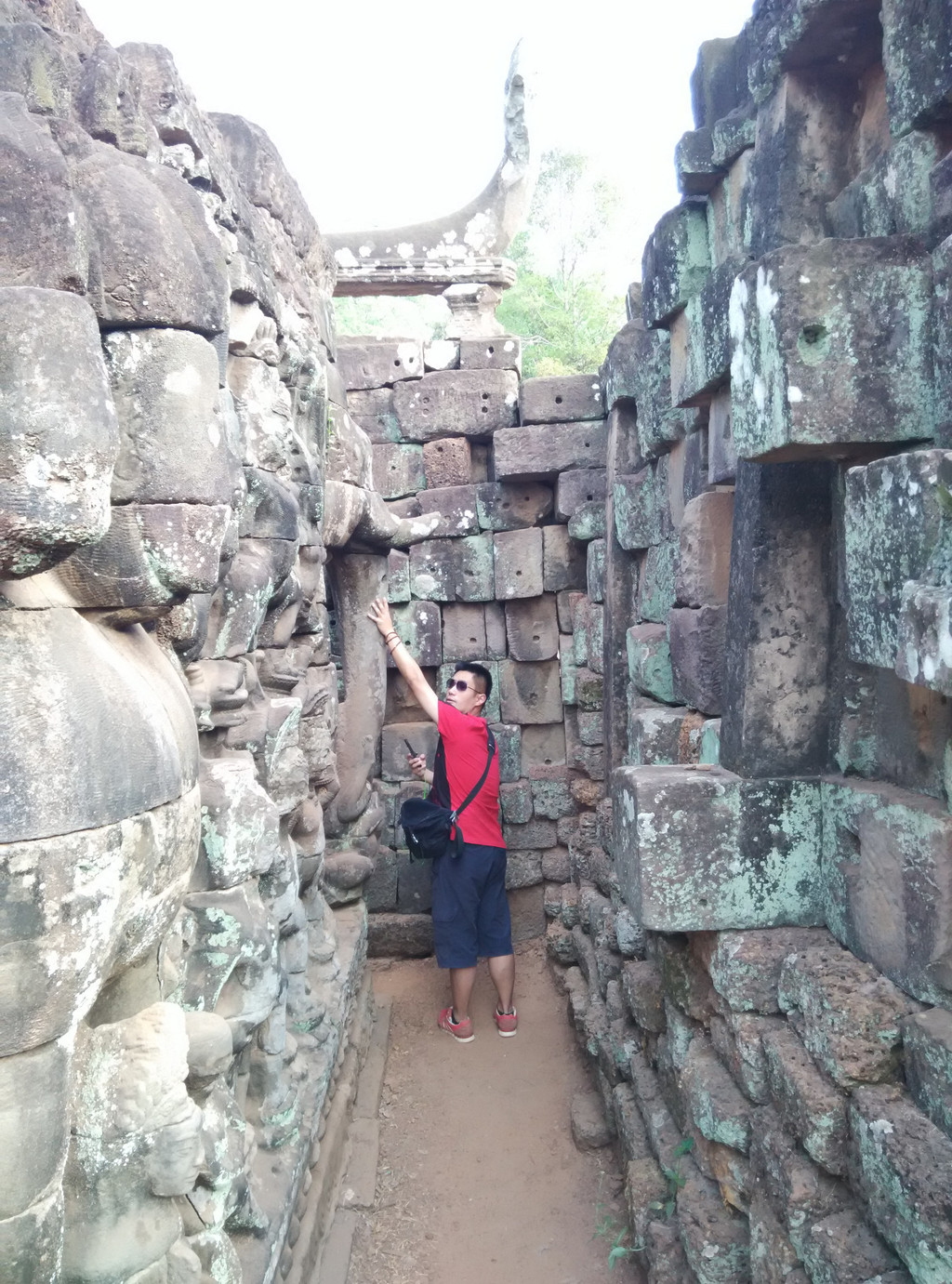 我们就这样在廊道中穿行,通往中央殿堂须经过19道石门,越往里走,石门越来越窄,高度越来越低,使进入的人必须低头方能顺利进入。这种设计亦体现出阇耶跋摩七世的一片孝心,让每一位进入者都必须低头向他的父亲行礼。