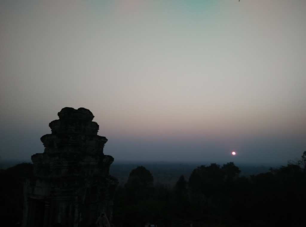 话说好不容易来一趟,又起个大早,又挤在人群里伸长脖子等了老半天,却连咸蛋黄的影子都没看见,实在有些不甘心。于是,随着人群的散去,我一步三回头地朝身后的吴哥寺望去。走到一半的时候,突然发现天光大亮,咸蛋黄似有破云而出之势,我赶紧拉着表弟往回跑,生怕错过见证奇迹的那一刻。