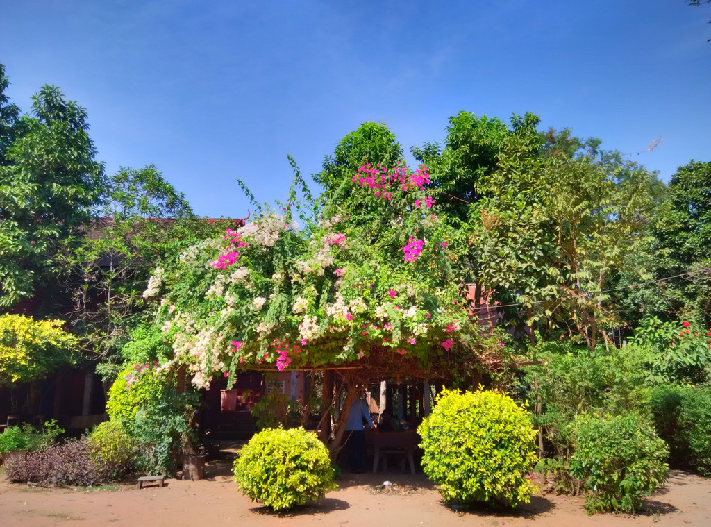 如今水池早已干涸的罗莱寺显得规模很小,可以看出损毁得挺严重,主殿还在维修,门口的植物倒是很茂盛: