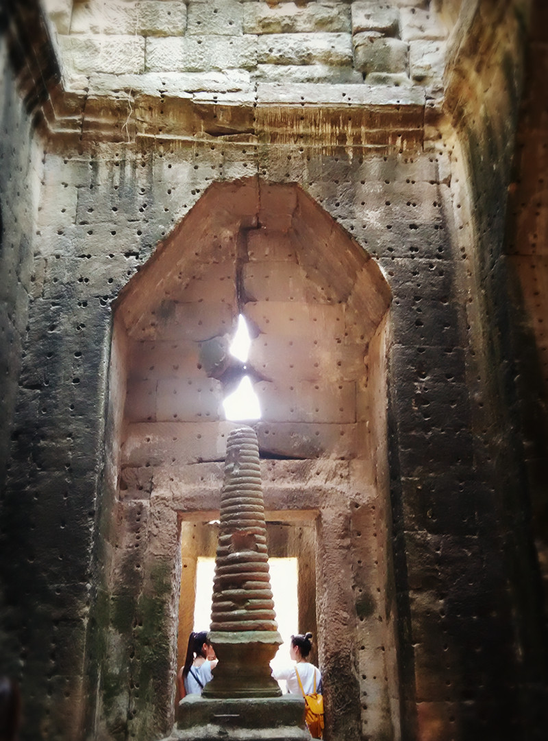 继续前行约十余分钟,便来到圣剑寺的中央殿堂,主要的建筑早已垮掉,但正中心尚有一柄石剑矗立,一说圣剑寺得名于此,另一说这是阇耶跋摩七世父亲的骨灰塔——一个螺旋式的浮屠石塔。石塔的上方刚好有一个如烛火状的石洞,当我们低头敬拜时,阳光透过石洞刚好落在塔尖,如同一盏点燃的烛台。真是一个神奇的组合,冥冥中有这样一个石塔矗立于此,冥冥中上方的石墙有了这样形状的破损,冥冥中这两个破损的石洞刚好能透进阳光,形成燃烧的火焰。。。是残缺,却也成就了另一种美。