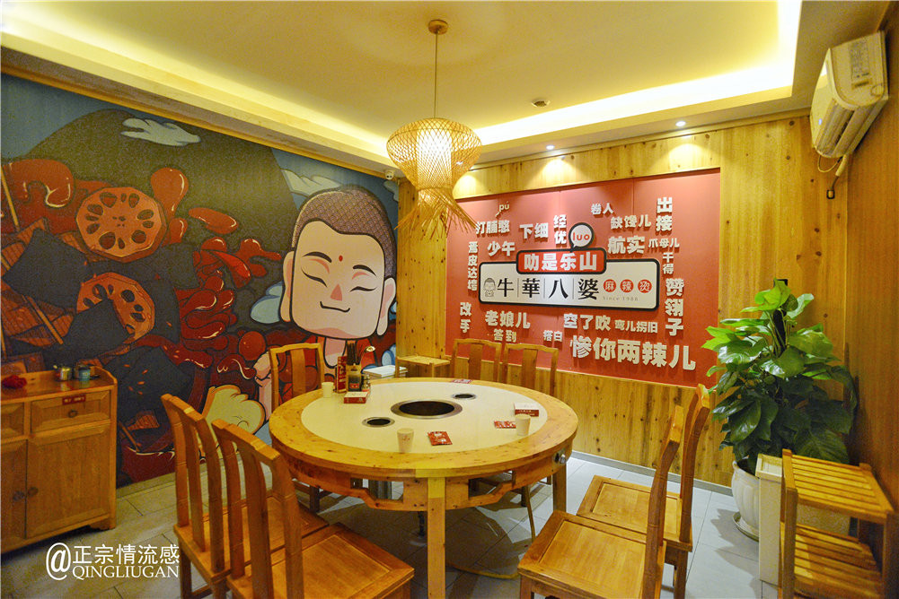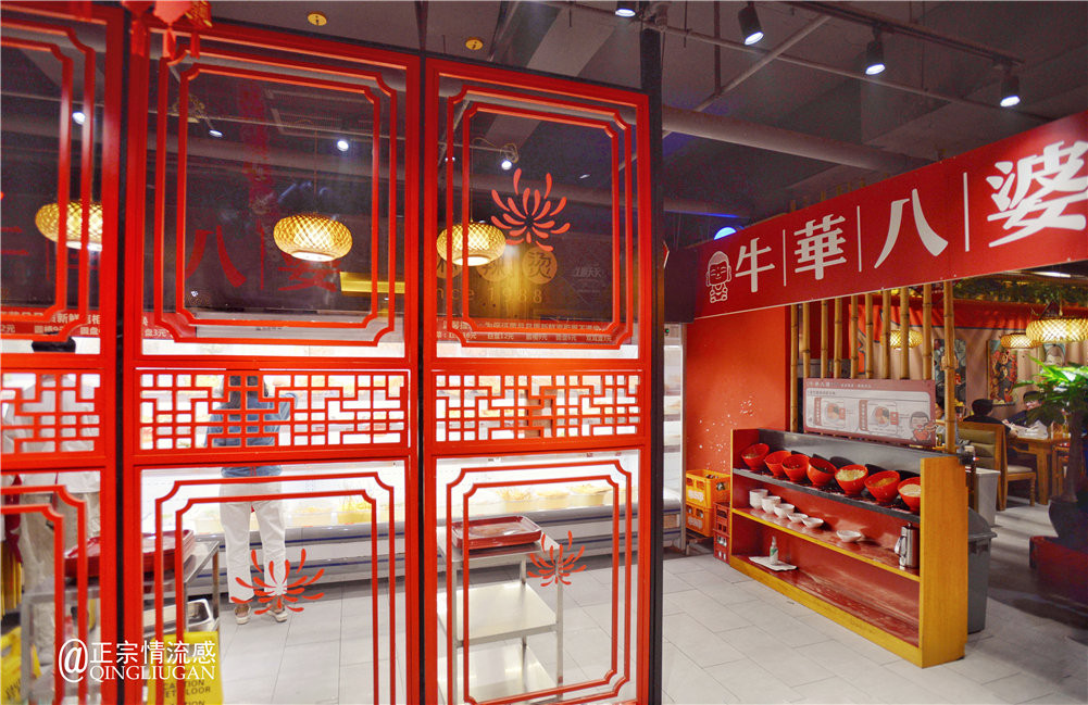 这家牛华八婆麻辣烫是春熙路店,整个店堂宽敞明亮,红色基调为主,还有包房可以聚聚,墙上还有不少四川乐山等地的言子(方言),有特色。