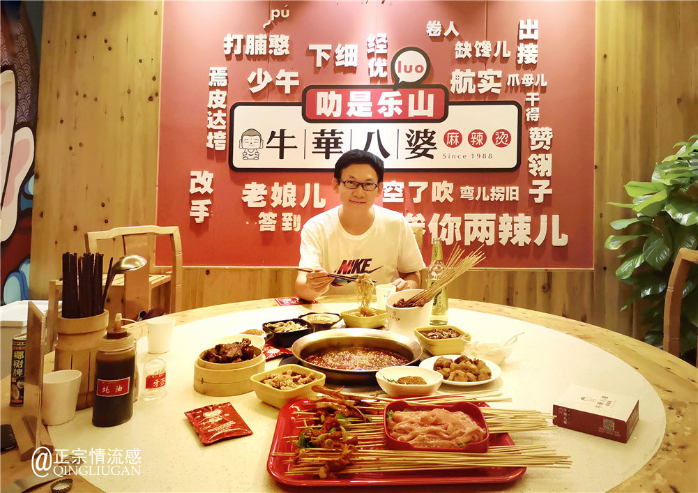 桥、岸、树、房、水......万物皆披上迷人的夜色,河水清澈,倒影如画。世间万物在这刻都充满了爱,心情越发舒畅,感觉胃口也来了,就在朋友的建议下,一起去附近体验一家来自乐山的美食串串🍢:牛华八婆麻辣烫 。