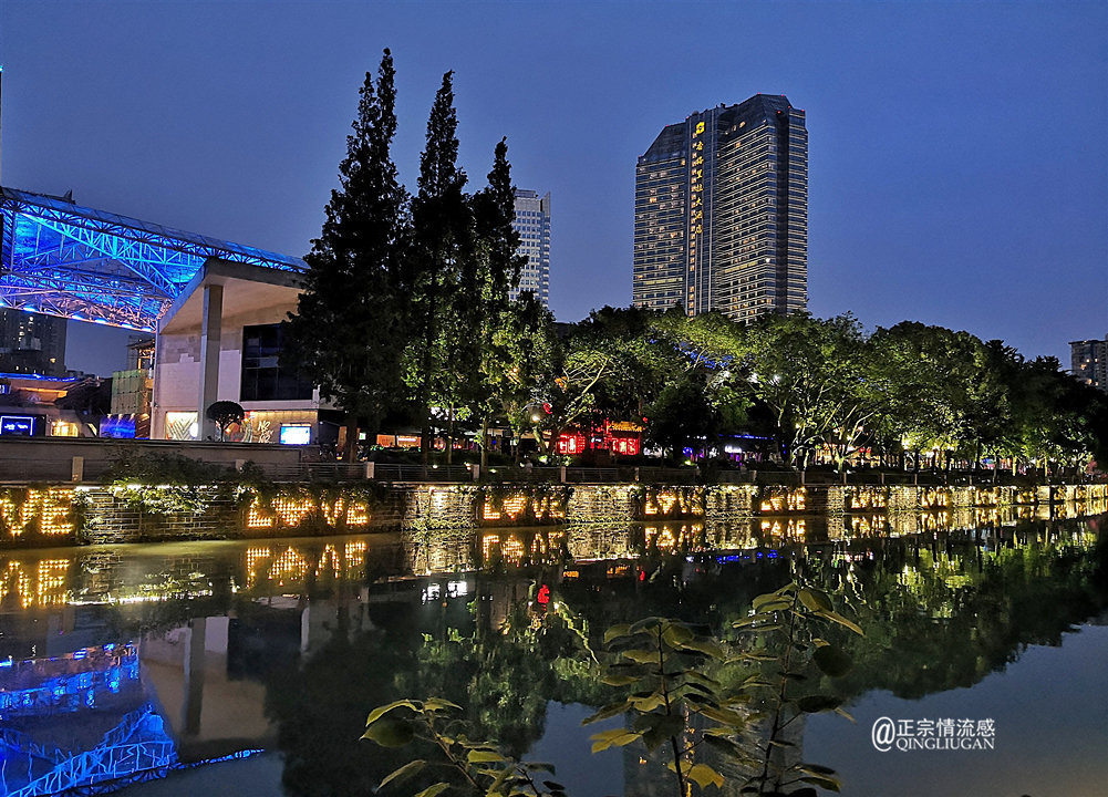 和成都的朋友一起来到东门大桥,漫步晚霞后的府河边。夜,慢慢展开她宁静中迷人的蓝和温暖的光。