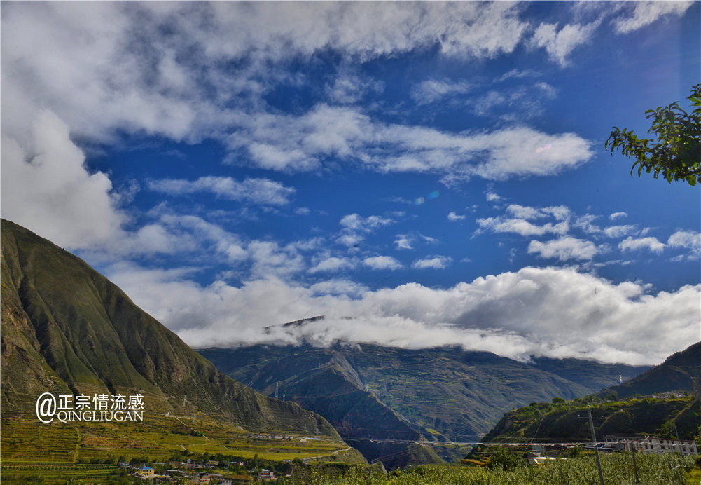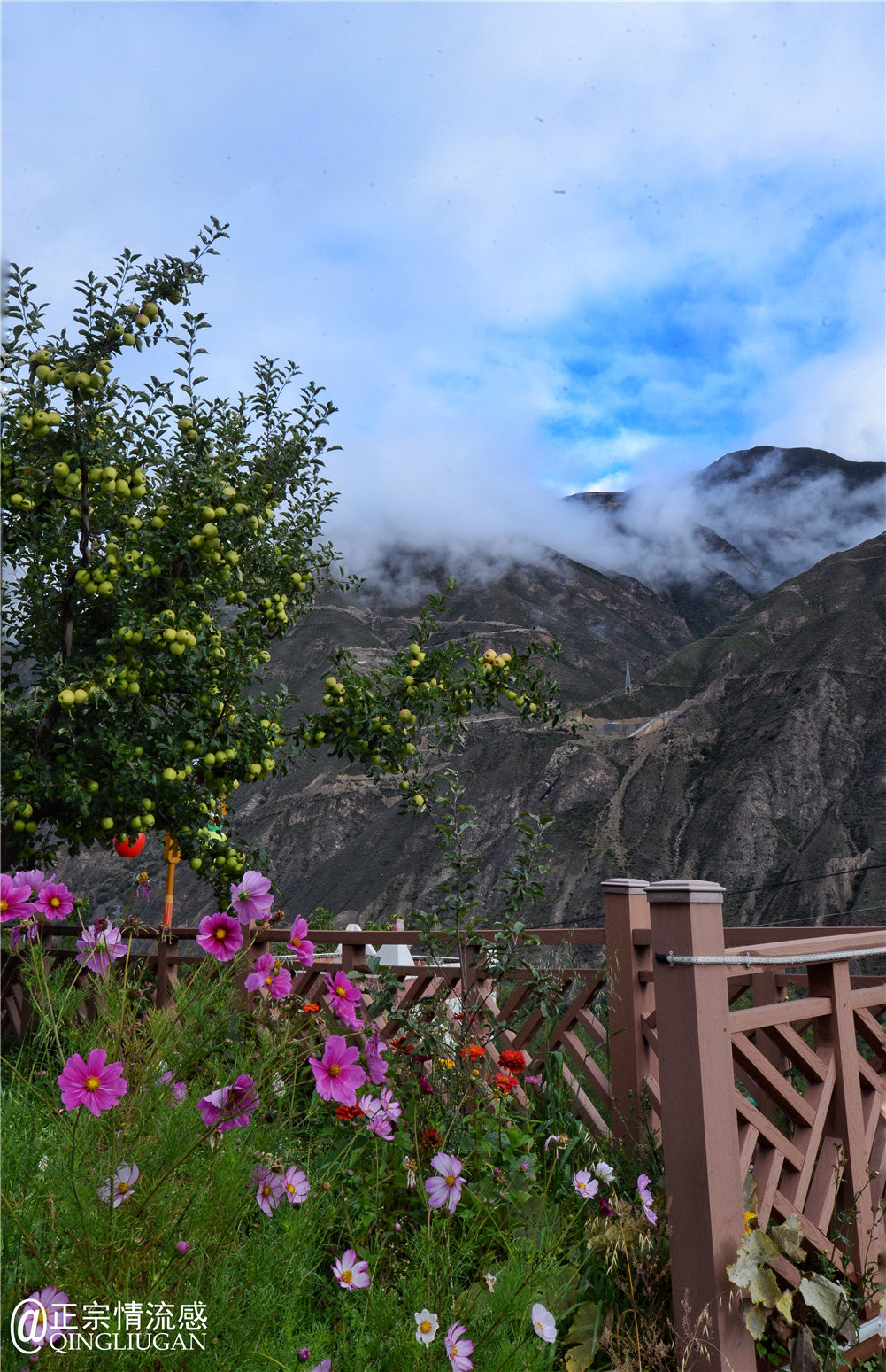 清晨起来,窗外树上挂满了苹果,院子里格桑花盛开,蓝天下群山飘着云雾,这是哪里的仙境?