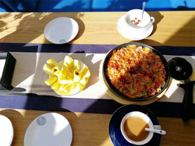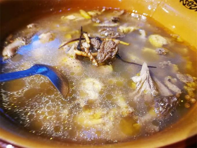 中餐厅有当地牦牛肉系列汤锅、松茸炖鸡、烤全羊、烤鸡、烤牦牛肉串等,菜品色香味俱全,光看着就令人食指大动。