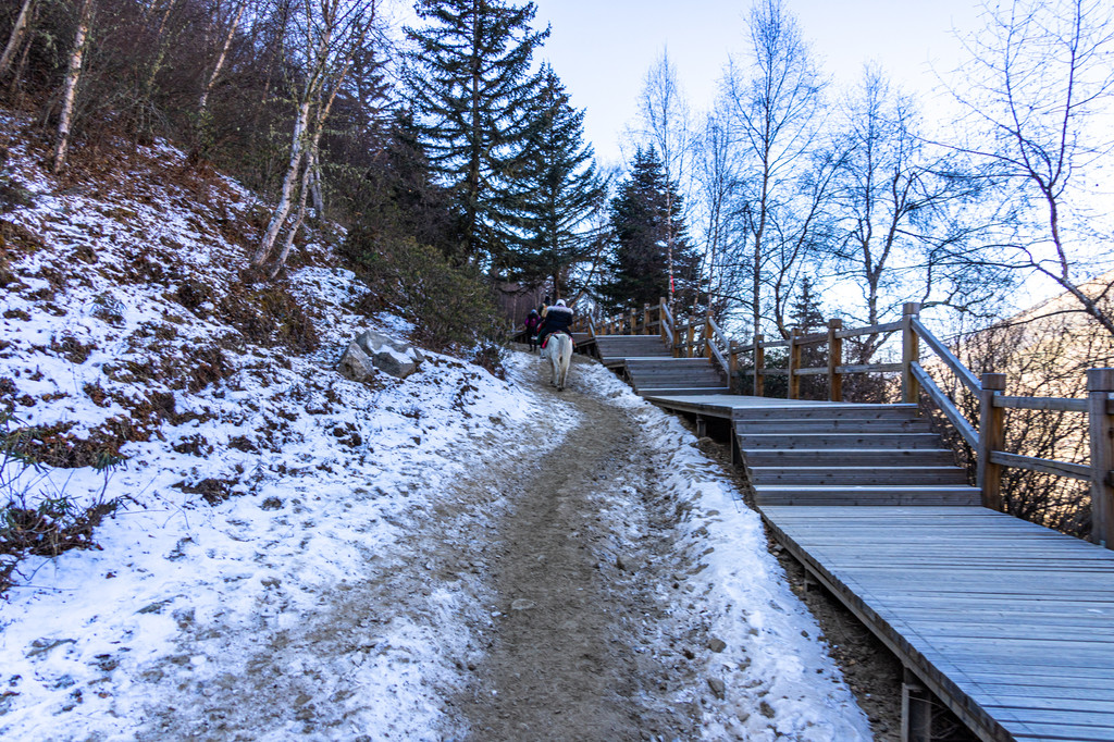 不同于长坪沟和双桥沟的地形,海子沟除了山门外的一小段木栈道,其余都是打断的山脊攀升,只能步行或者骑马,对于体力的要求也是最高的,为了更好的欣赏海子沟的美景,我们提前一天预订了去往海子沟的马匹,从海子沟大门口达到骑马点需要先沿着木栈道徒步一段距离,然后才可以骑行。