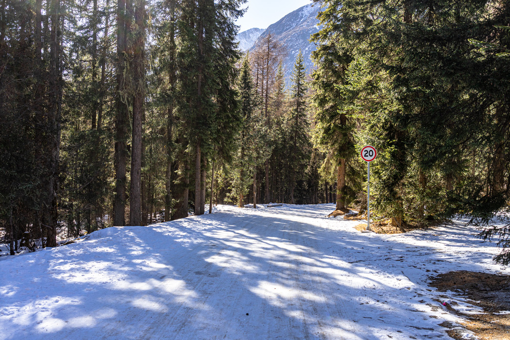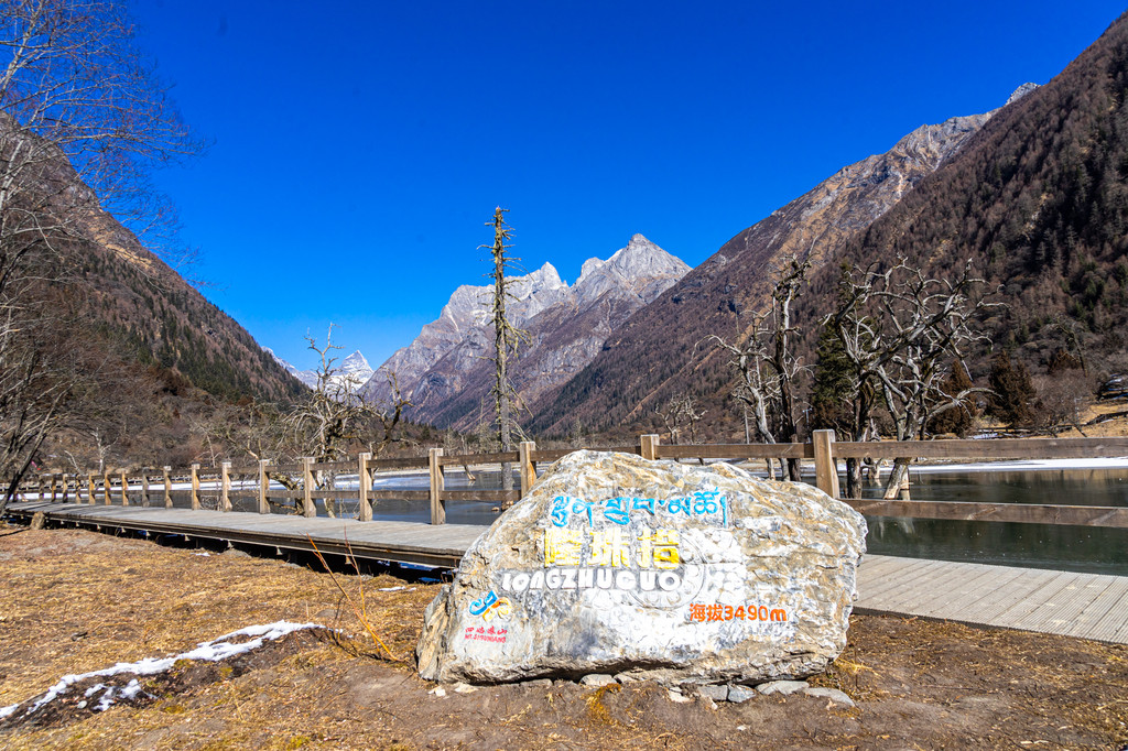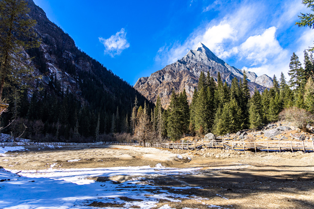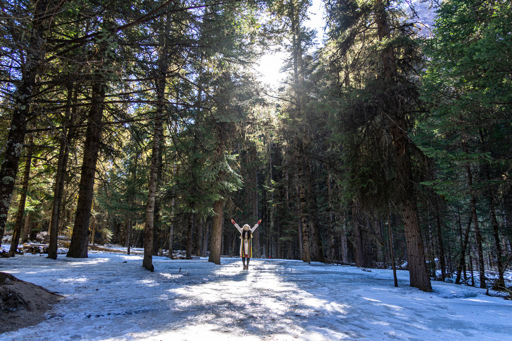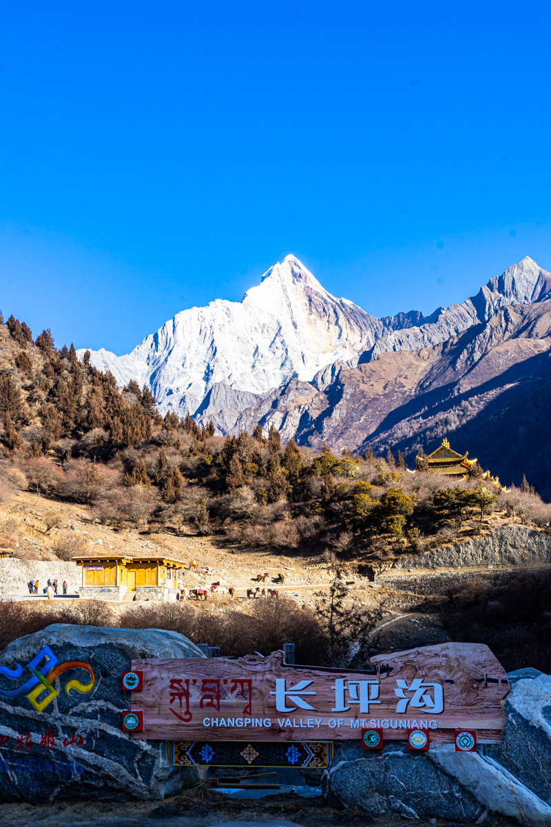 跨年之旅的第二天走进了长坪沟,淡季的长坪沟门票是50元,整个沟长约29公里,可以乘坐景区观光车到景区大门口,然后通过步行或者骑马游览。在景区的大门口远远的就可以看到斯古拉寺和远处的幺妹峰。