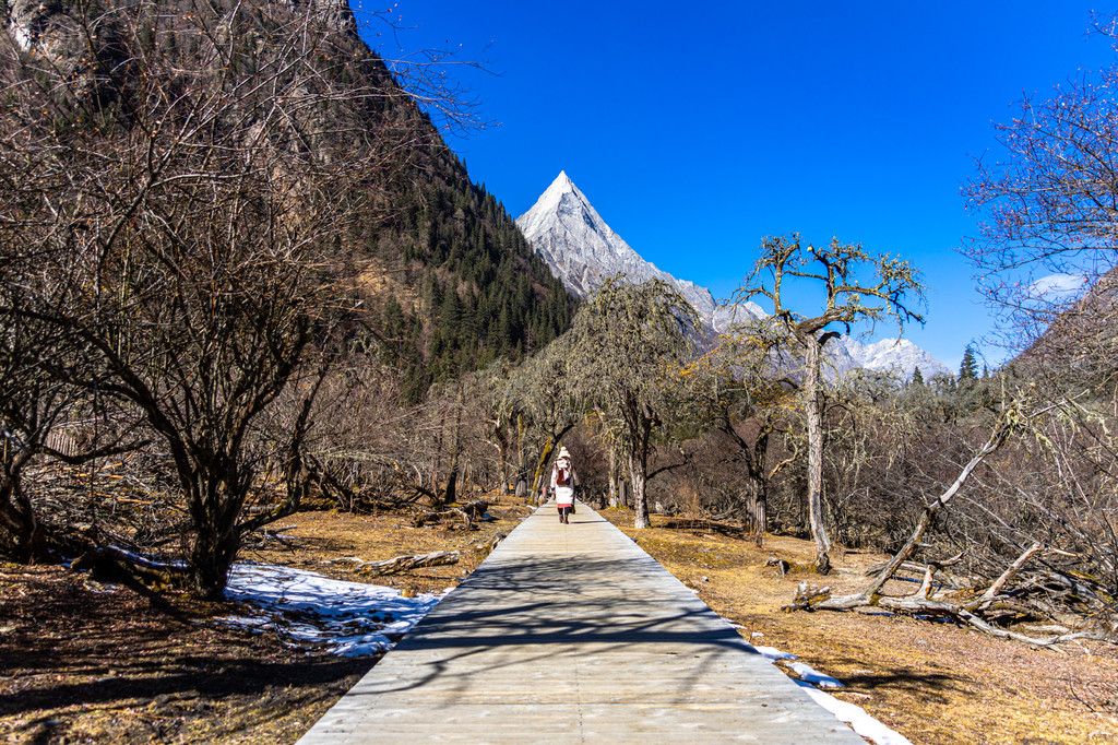 出斯古拉寺稍走两步便可以看到两条路,一条木栈道步行游览,另外一条是骑马游览的马道,两条道路沿线的风景各异,最终我的选择是去沿木栈道而上,返回选择马道。徒步初期一定要注意节奏,不能太快,由于高原地区,所以可以放慢脚步慢慢适应。沿着木栈道而上沿途的风景也不错,可以一直遥望远处的幺妹峰,途中会经过虫虫瀑布、枯树滩、甘海子及木骡子等景点,每一处景点从不同角度,都会发现不同的美。