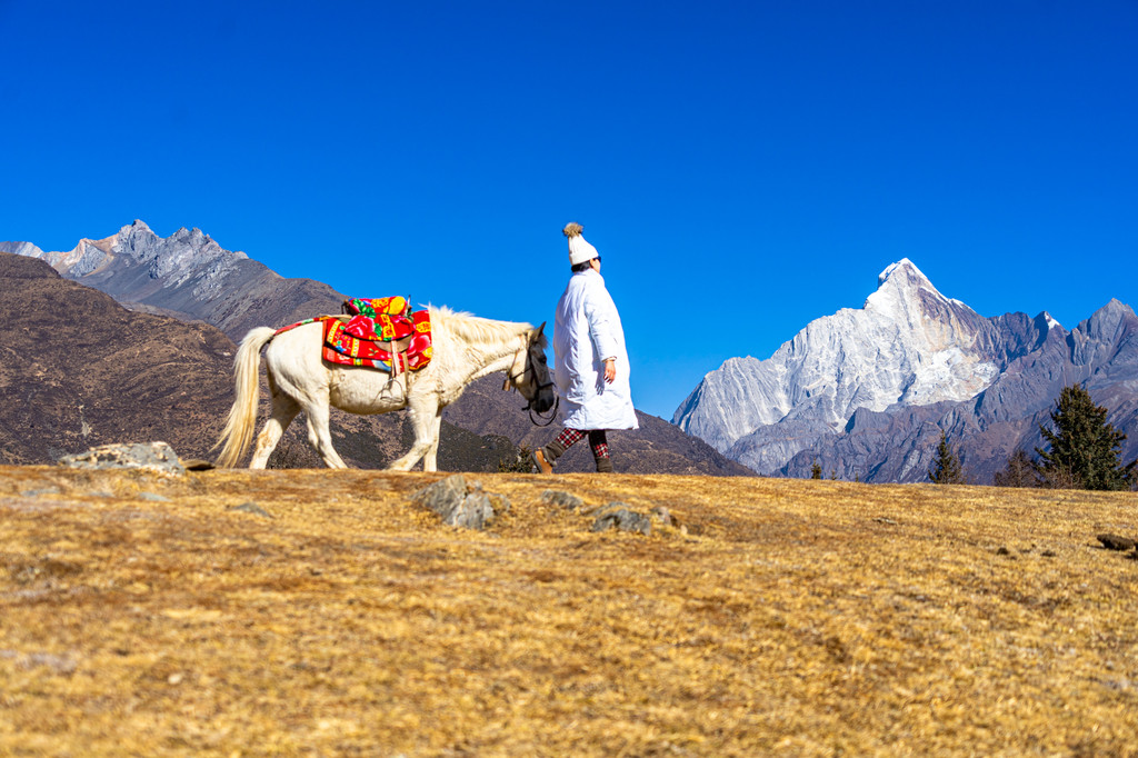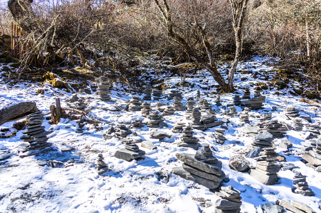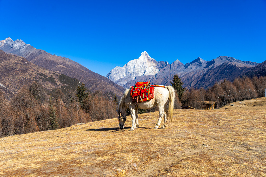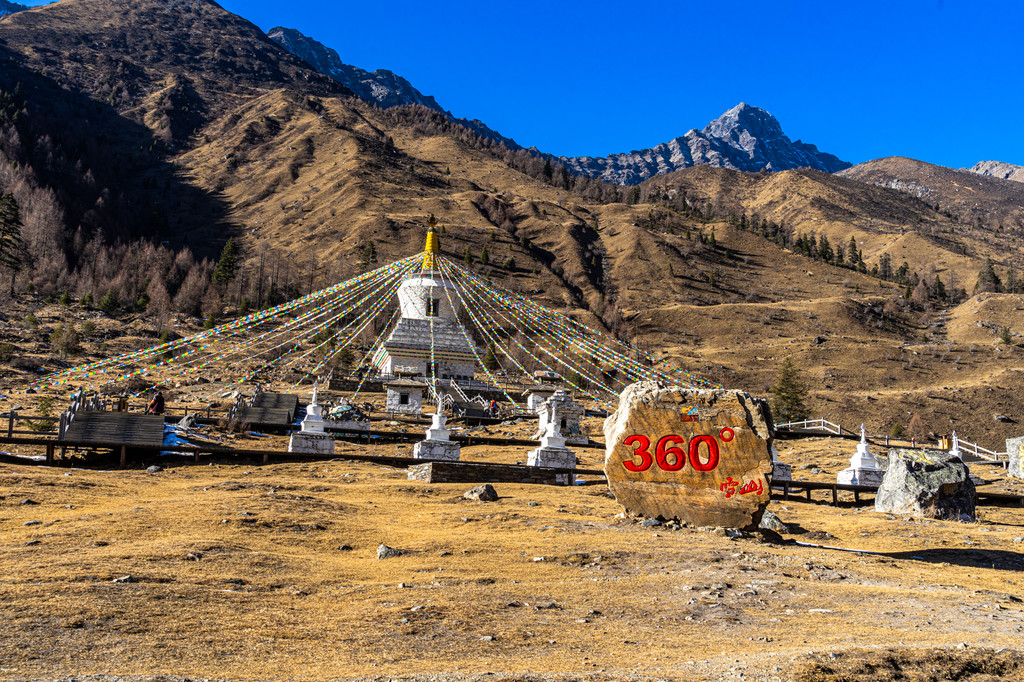 骑马我们达到的第一站是朝山坪,这里是观看四姑娘山的最佳位置,同样每年农历五月初四这里也是村民们拜山神举办朝山会的地方,每到这一天朝山坪上插满经幡,身着盛装的村民从四面八方赶来,带上青稞酒、牛羊肉和烧馍馍来朝拜四姑娘山,虽然没赶上盛会,但在这里远远的遥望四姑娘山也是一种满满的收获。
