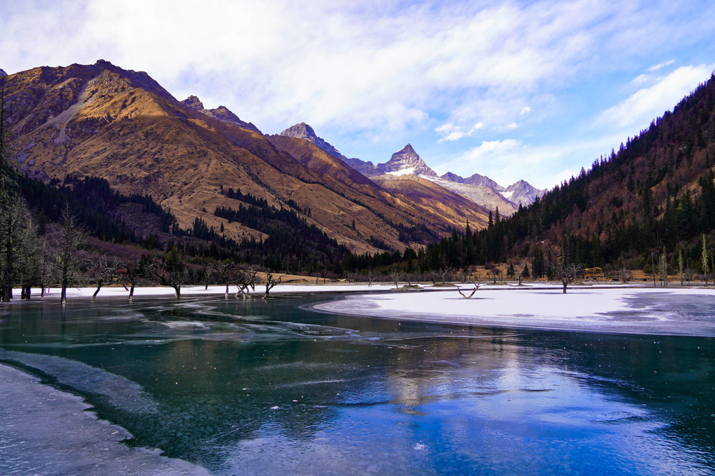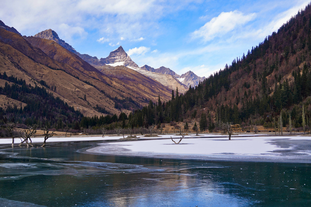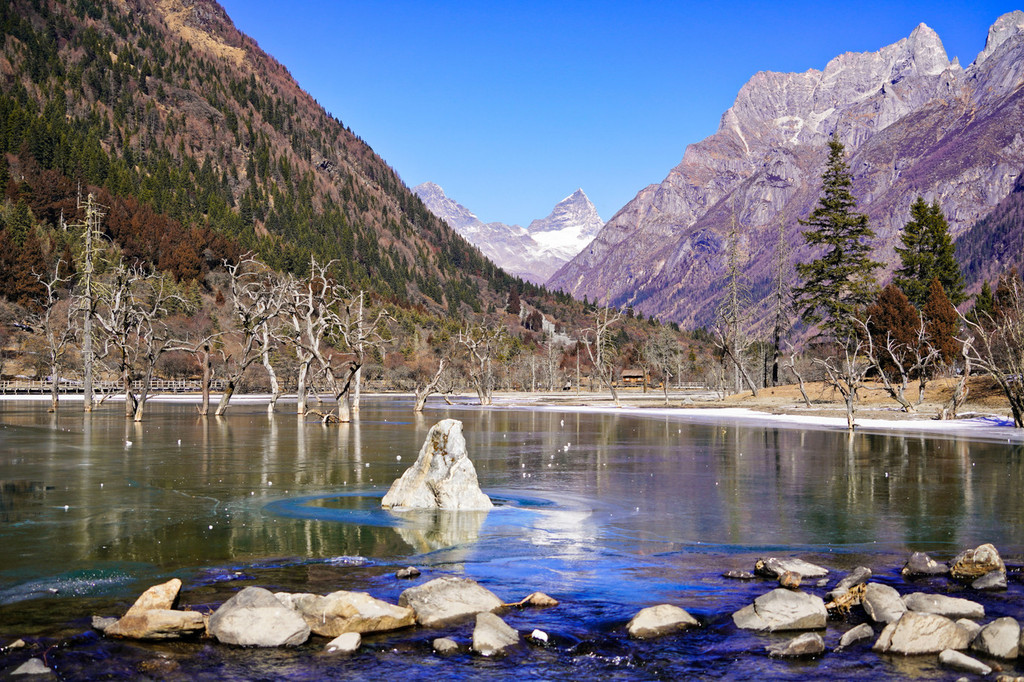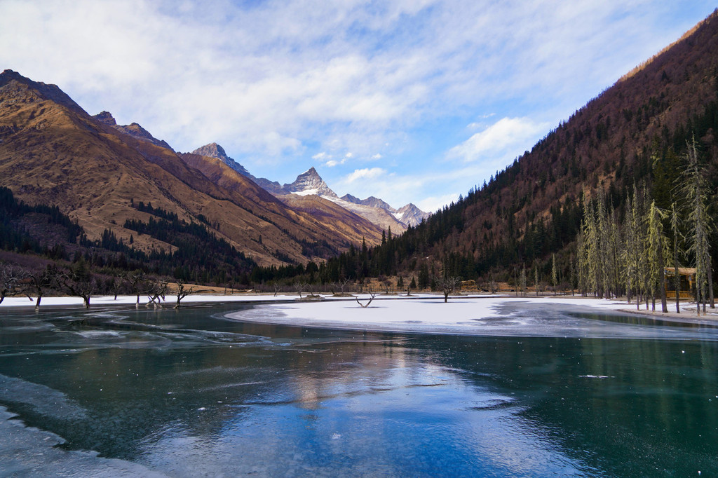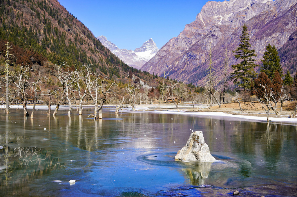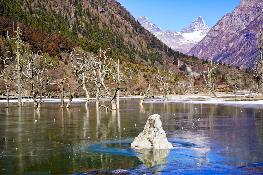 为照片关联地点 为照片关联地点沿着栈道一路前行,远离城市的喧嚣,迎着冬日骄阳,在长坪沟静静的感受大自然的清新。经过虫虫瀑布之后,最值得期待的景观要数枯树滩了。原本平静清澈的湖面,因为湖中稀稀疏疏的枯树,显得格外神秘,又像是一幅可歌可泣的国画。其实,这里曾经是阿巴朗依与墨尔多家族交战的古战场遗迹。墨尔多家族用魔法引来洪水,淹没了阿巴朗依的军队,死去的士兵化成了枯树,屹立在此,长久不倒,意为誓死守侯自己的家园。冬日的枯树滩,一半是水,一半是冰,两级分化,又对应互补,呈现了和谐之美。