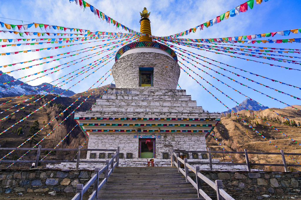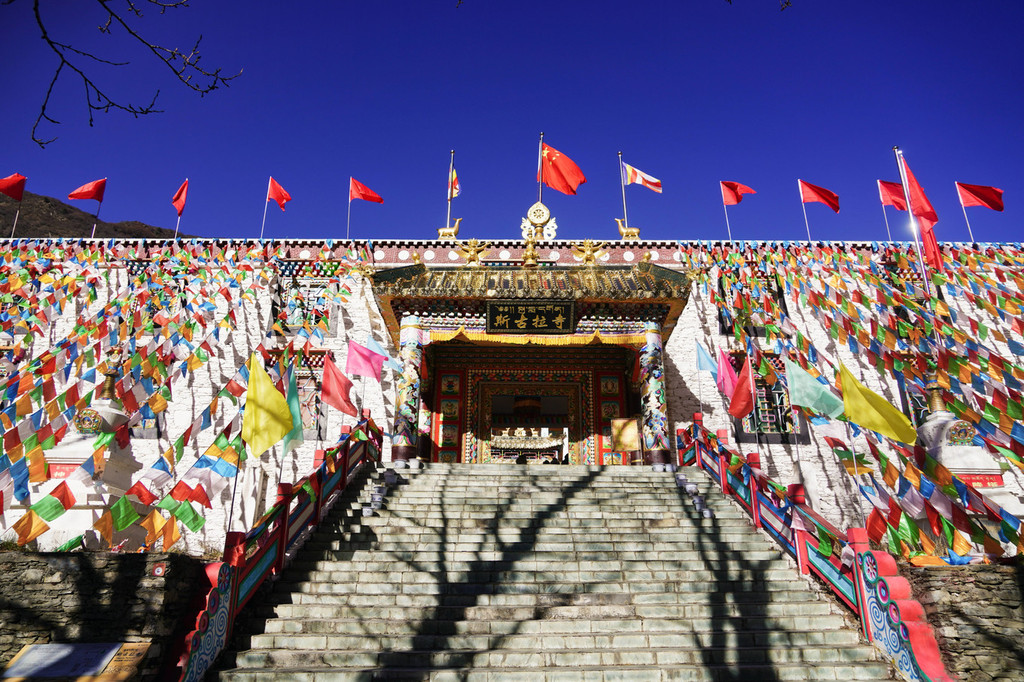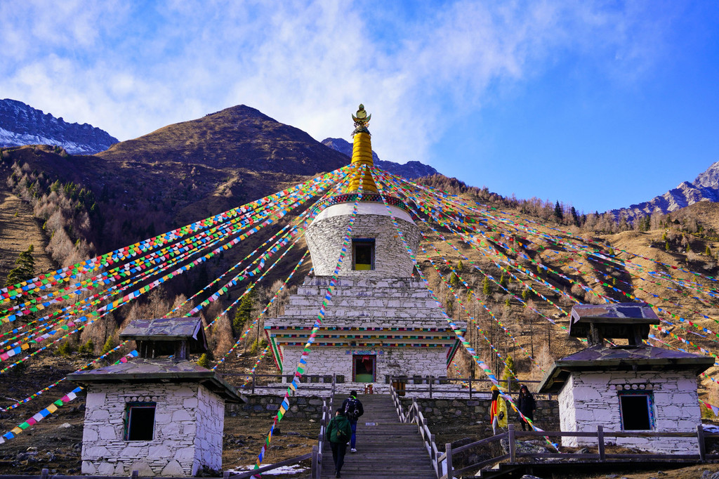 为照片关联地点 为照片关联地点从步行栈道徒步沟内,首先会经过一座金碧辉煌的喇嘛寺,五彩斑斓的经幡包裹着圣洁的白塔。一排气势恢弘的白塔后方就是喇嘛寺的内殿,里面供奉着藏民们信奉的神明。经过喇嘛寺沿途森林风光无限好。参天古树,沙棘遍野,湖光山色,令人心旷神怡。
