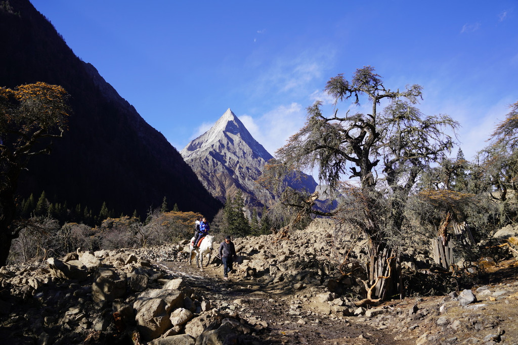 为照片关联地点 为照片关联地点为了感受多元化的四姑娘山之美,我们骑马踏进了海子沟。走进巍峨曲折的丛林,体验近乎消失的马帮文化。藏民的小马都有自己的名字,我骑的小马叫雨点儿。雨点儿是一匹年仅8岁的小棕马,它就像一个涉世未深的孩子一样,喜欢新鲜事物,酷爱探险。每当雨点儿走到紧靠悬崖的马道上,它总喜欢靠着悬崖走,尽管你用缰绳把它拉到靠里的道路,走过三五步,塔又溜到靠悬崖边去了。几乎没经过一个水滩,它都要停下来喝水。雨点儿虽然有点小顽皮,但它每一步都走的很稳妥, 也很听主人的话,很灵性。