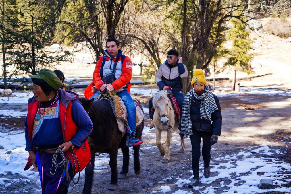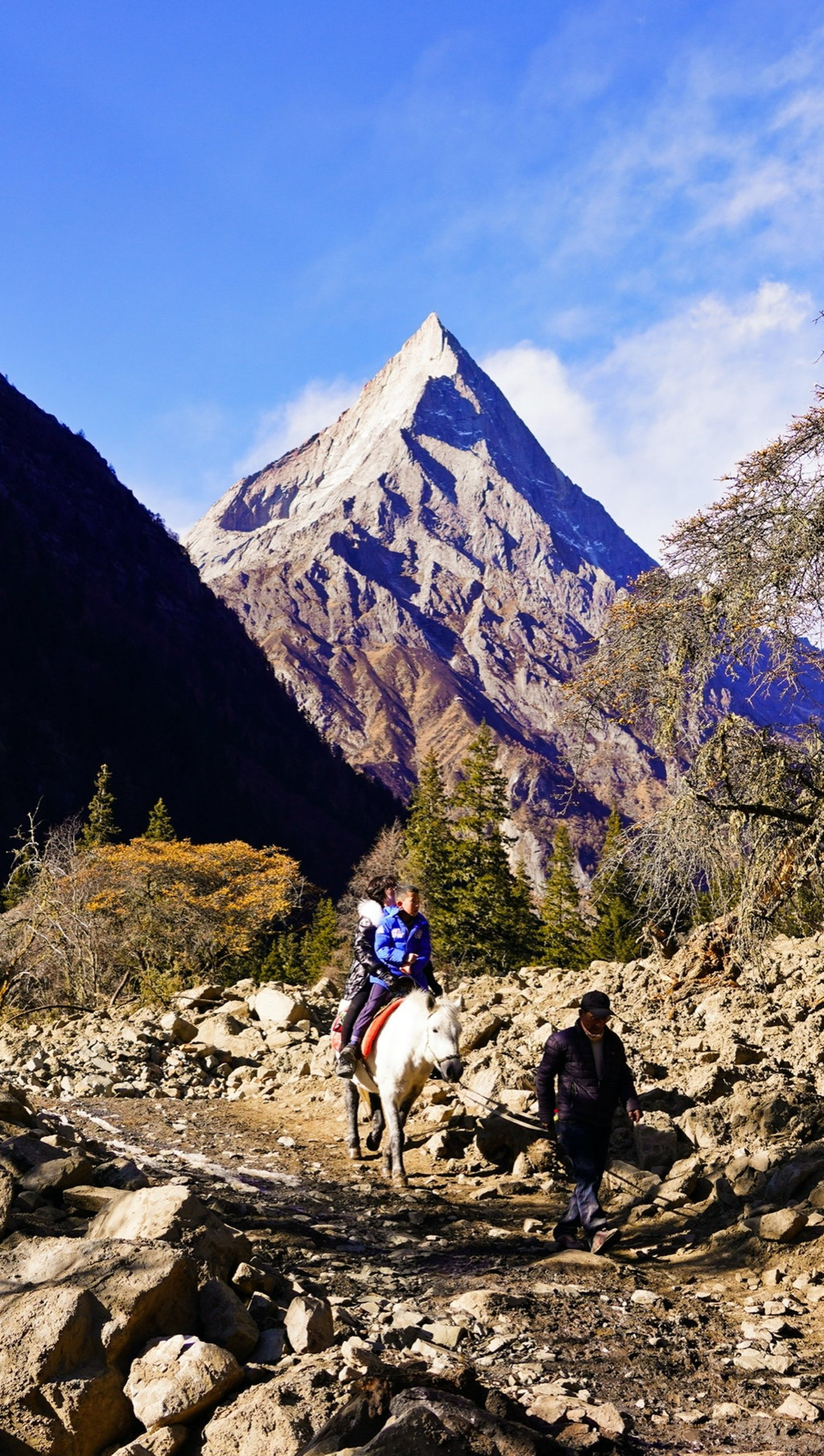 为照片关联地点从海子沟的沟口徒步一段上山栈道,就到了骑马的入口。沿着蜿蜒曲折的马道缓缓前行,两旁的景色掠掠而过。一侧是万丈深渊,一侧是沟壑纵横的峡谷。山坡半腰星罗棋布的散布着藏乡村寨,就像是一道玉带盘绕山间美妙极了。