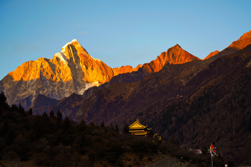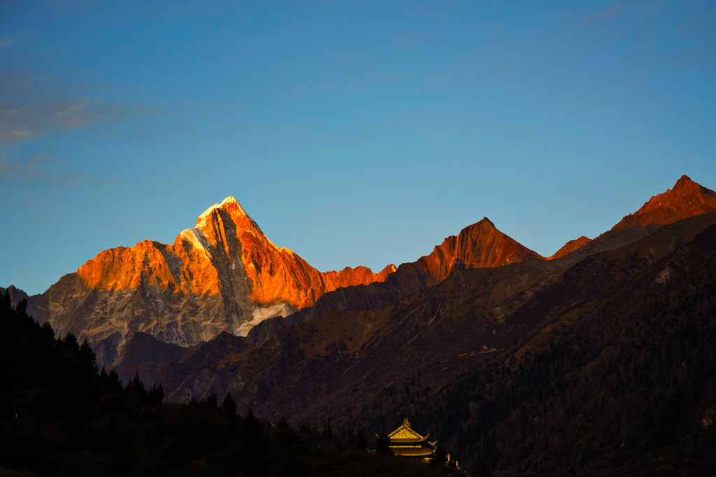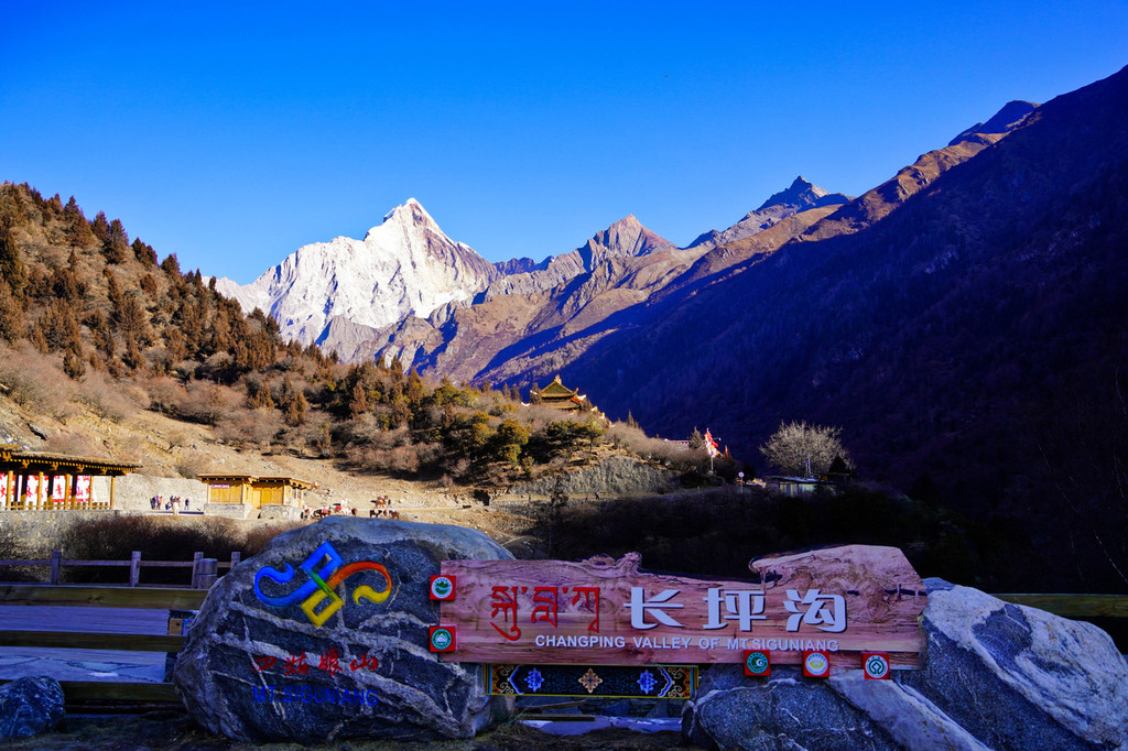 为照片关联地点 为照片关联地点 为照片关联地点 为照片关联地点 为照片关联地点 为照片关联地点长坪沟沟口,一处自带景区logo的日照金山打卡地。长坪沟的景区牌坊旁,就能欣赏到绝美的日照金山盛宴。这处绝佳的观赏地点,不仅可以看到四姑娘山的幺妹峰,其他三座山峰亦可清晰得见。日落时分,山黛暗沉,落日余晖洒向雪山之巅,泛着金灿灿的光晕,美不胜收。漫漫天际,以轻风为笔,以霞光为彩,喇嘛勾勒出了四姑娘山四座峰的仙姿神韵,金碧辉煌的喇嘛寺为其锦上添花,组成了一幅旷世绮丽的绝代佳画。