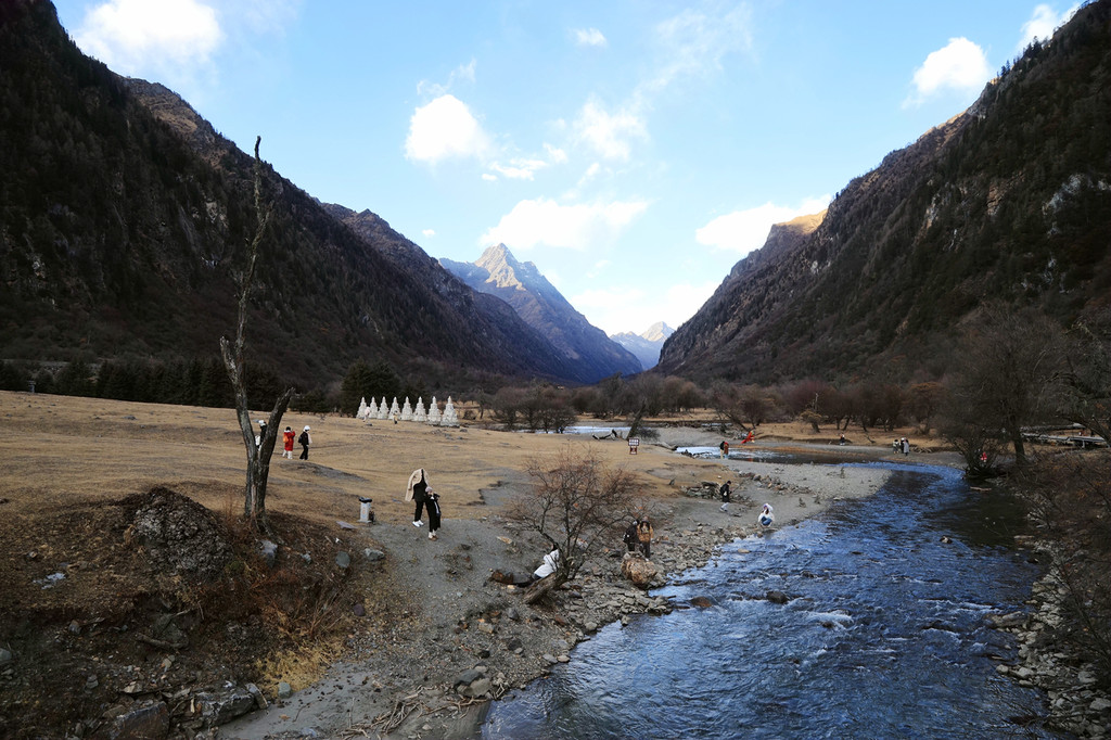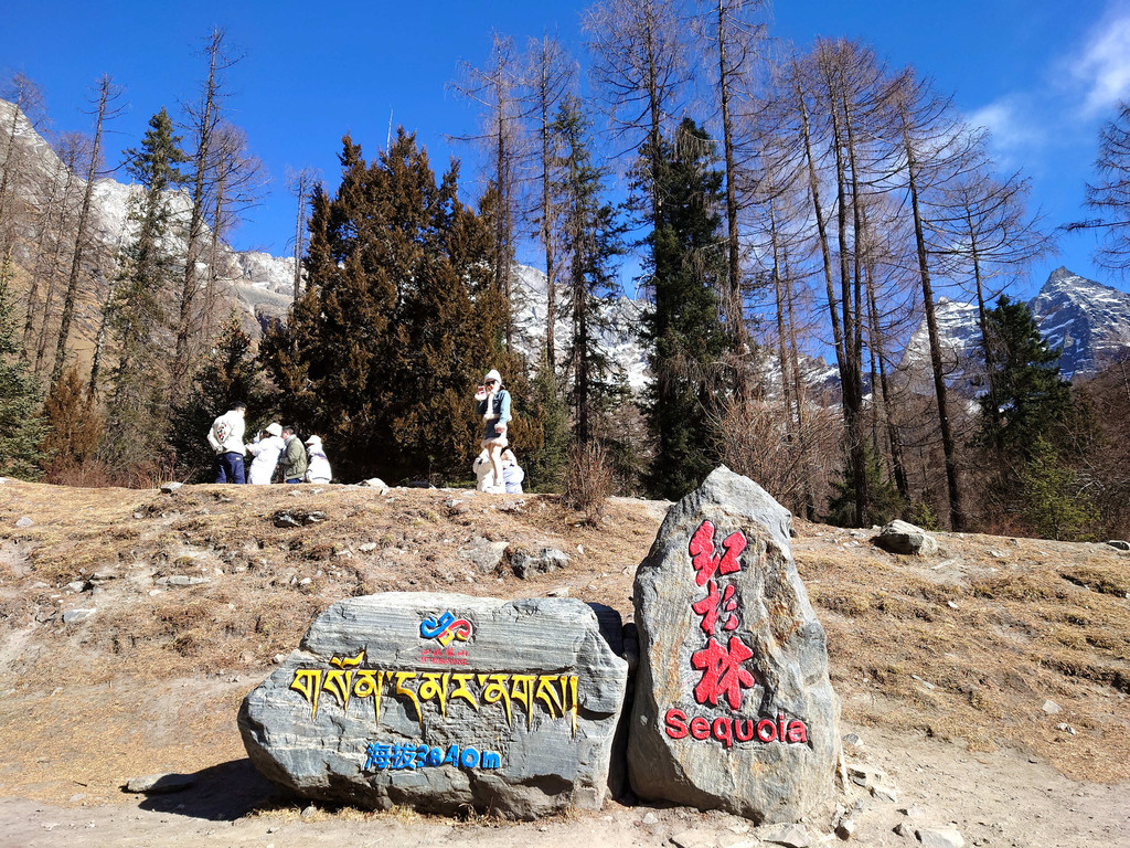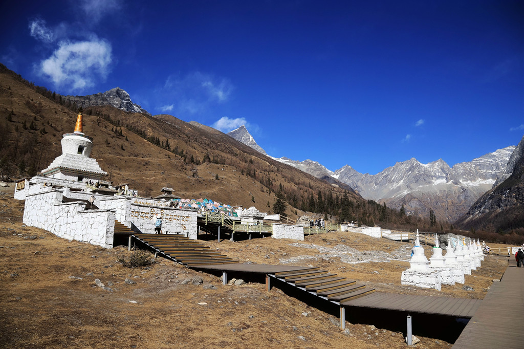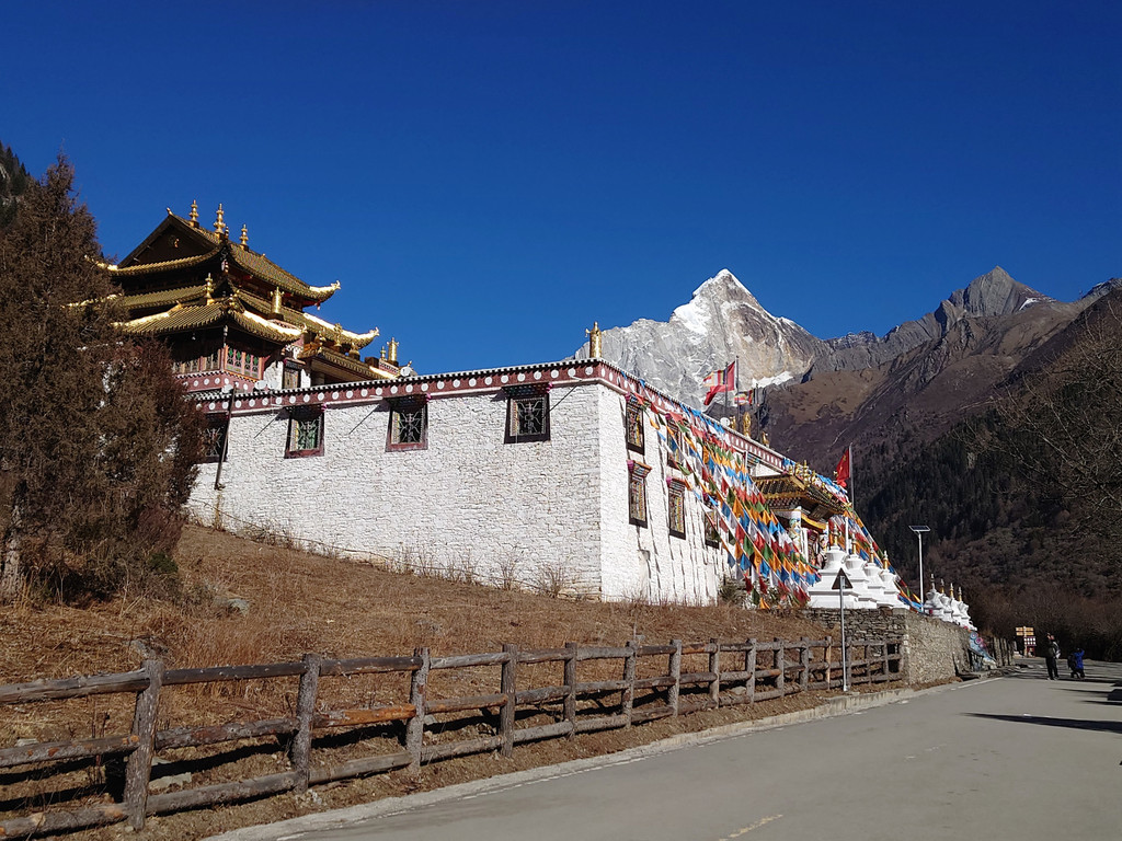 我在红杉林站待不久,便往下到布达拉峰景点。这里视野好极了,极目所见四面山顶上披着皑皑白雪,群峰下形成一条山沟,一条大道从中间穿过。山坡屹立一座藏传佛寺,白塔、转经筒、五彩经幡、祈福藏文…等典型藏传佛寺特征,在这天地间更显庄严。