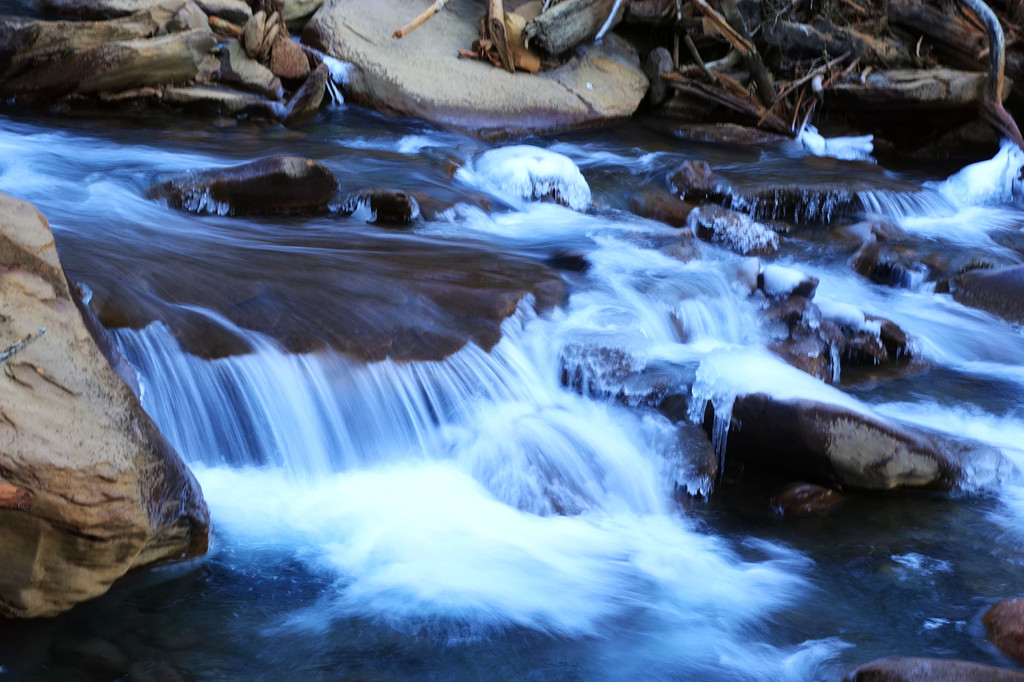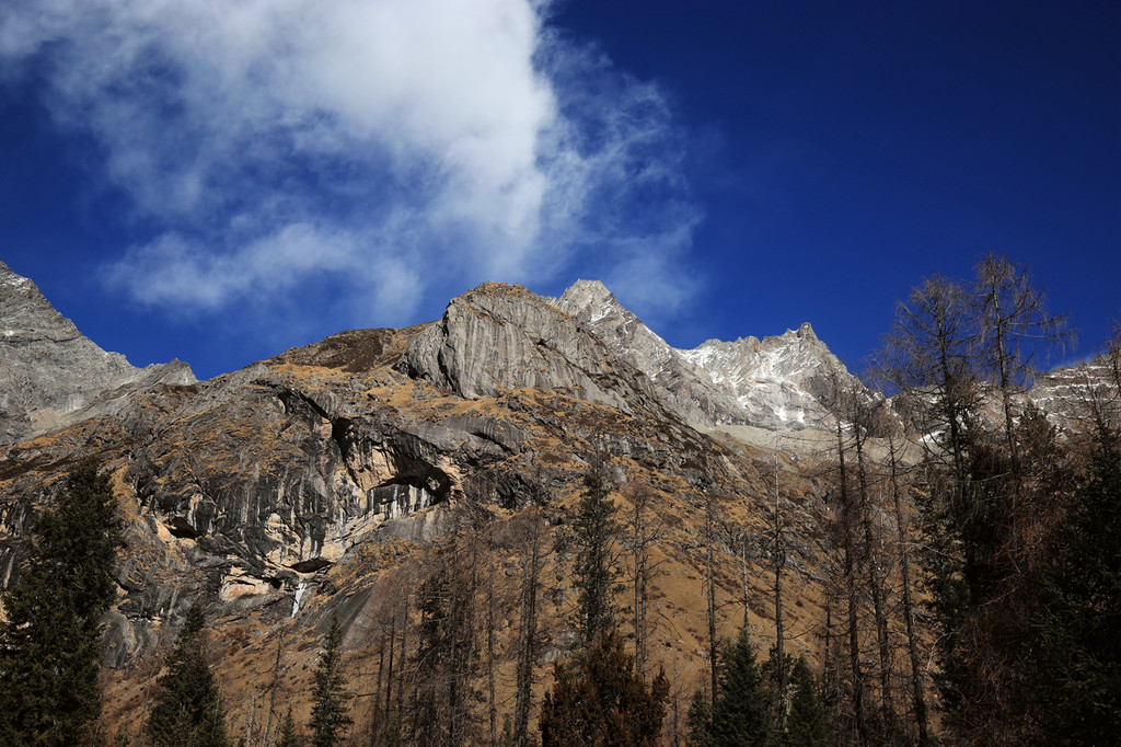 第二天一早去长坪沟,我2020年11月初和朋友走过,当时正值深秋满山彩林非常漂亮,我们走了九公里到木骡子,再骑马走回长坪沟山门,所以对木栈道和风景点还有印象。12/24还是大晴天,但早上阳光未照入沟里,非常寒冷,只有零下4度。我戴上口罩防寒,但没多久口罩就湿了,应该是呼出的热气和外面的冷空气结合的结果,眼睛也蒙上雾气,我拿下一擦有些地方还结冰,没多久我就把口罩摘下来,太不方便了,还好沿栈道走了约2公里,阳光开始射进来,才温暖些。沿途一直看到四姑娘山皑皑山顶,但囿于早上光线反差太大,沟里阴黑,山顶明亮,曝光容易顾此失彼,所见美景无法用相片真实记录下来,加上树林已不若11月时惊艳,颜色单调,还好有山壁上挂下的冰瀑和溪流里流水和冰、石共舞,让我的单眼相机有了用武之地