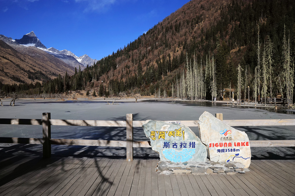 接下来在斯古拉措(“措”是藏语湖泊的意思)及隆珠措我停留较长的时间,这两个高山湖泊都已结冰,不用问湖上是否可以蹓冰,因为景区工作人员紧盯着,用大声公请游客远离湖面,不要踏上去,以免发生危险。在斯古拉措沿湖边走一圈时,看到狂风卷起黄沙飞起,风起跟着一阵风沙走石,走在其间非常吓人,有几次我只能压低帽子,深怕风沙吹入眼睛,还好大风只表演十多分钟后谢幕,又归于平静。大地的力量令人敬畏,它只要一出声,洪水、土石流、沙尘暴、旱灾、雪灾、风灾、火山爆发、地震…等天灾造成的伤害很大。人类还不自知,还有时间打仗,相互对抗,自相残杀,最是愚蠢