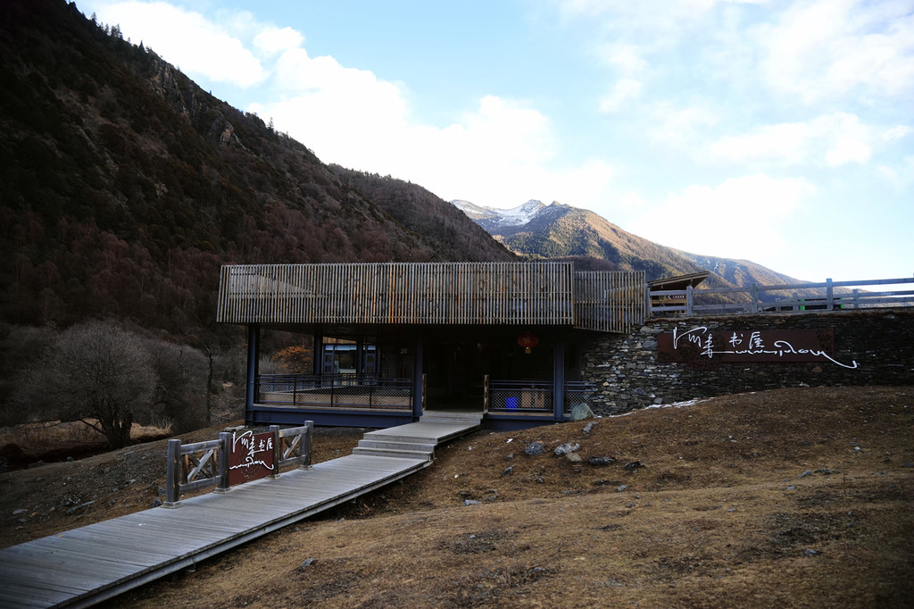 最后一站是人参果坪,这时已是4点半,川西虽然太阳较晚下山,但四周山峰鞍部已照不到阳光,只有山顶亮着,形成很大的反差,不是很好拍照。这里还有一间“阿来书屋”,应该是喝咖啡看书的地方,我到此时已关门,没能入内一逛有点可惜