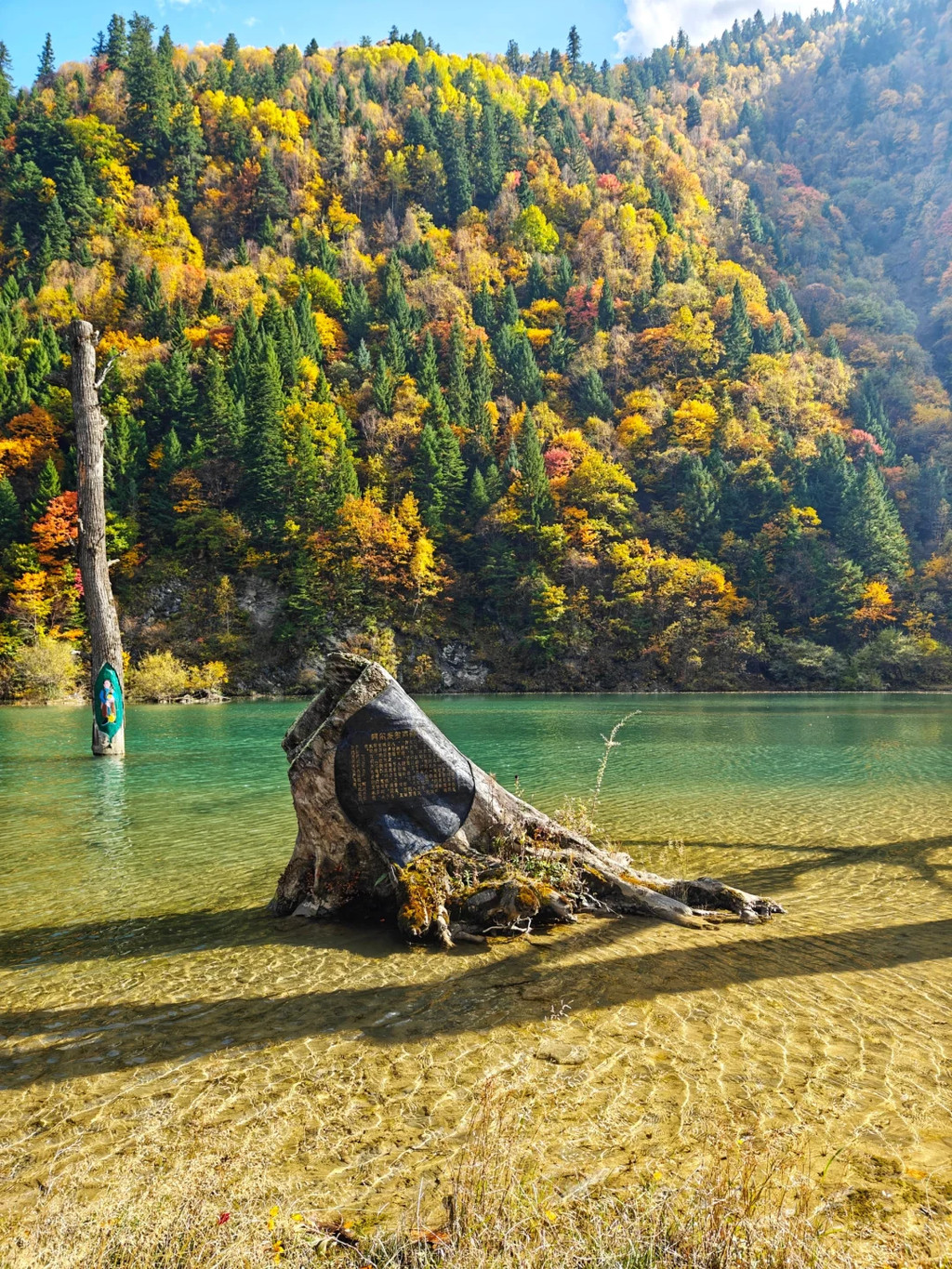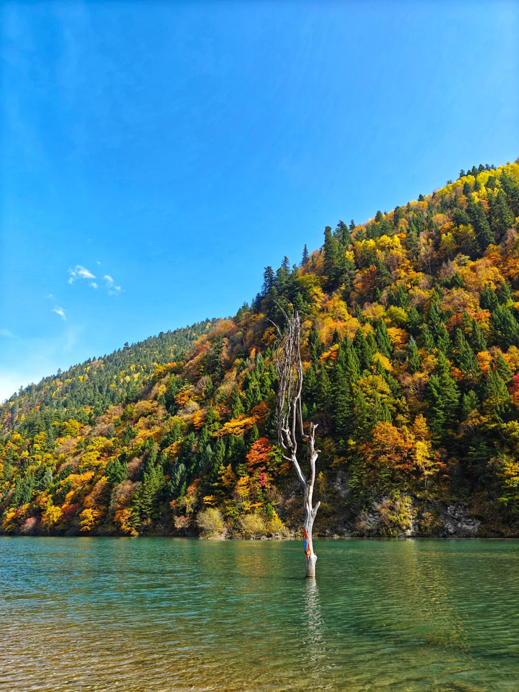 路边一个湖,和山上的彩林形成了水中倒影,有彩林的映衬,碧蓝色的湖水搭配着彩林真的很出片,可以坐船,有阳光的话会更好看!