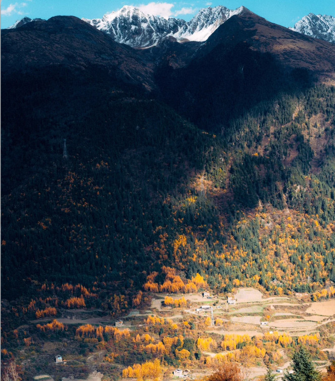米亚罗的红叶就是国道317线两旁的山坡地带,米亚罗的红叶从鹧鸪山开始蔓延,近3000米的海拔落差让红叶次第倾泻而下,从米亚罗镇出发,约5公里有桑丹寺有大面积的雪山压迫感,实属壮观。除了桑丹寺背面没有雪山,放眼望去,雪山群起伏连绵,横贯天地。