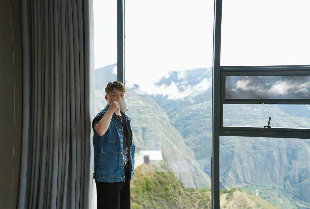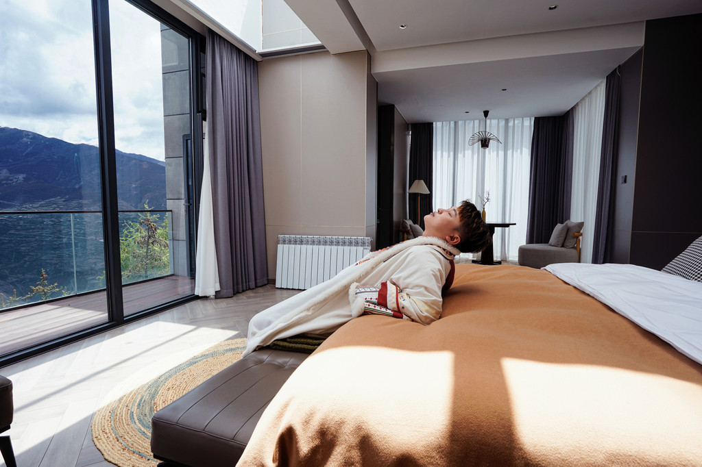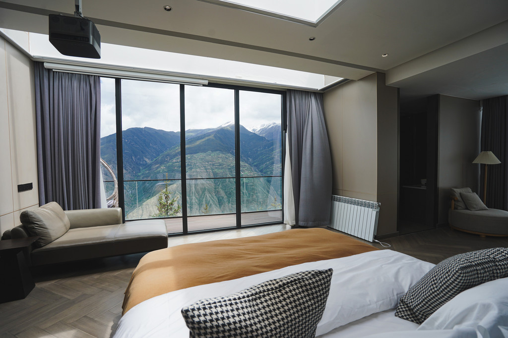 推开「悦崖·270°观景房」的橡木门,落地窗就像个魔术师,把雪山直接推到了我面前。我轻轻敲了敲玻璃,仿佛在跟雪山说:“嘿,伙计,这三晚归我了!”酒店每个房间都配备了智能供氧系统和地暖,这下高反什么的,统统不用怕了。