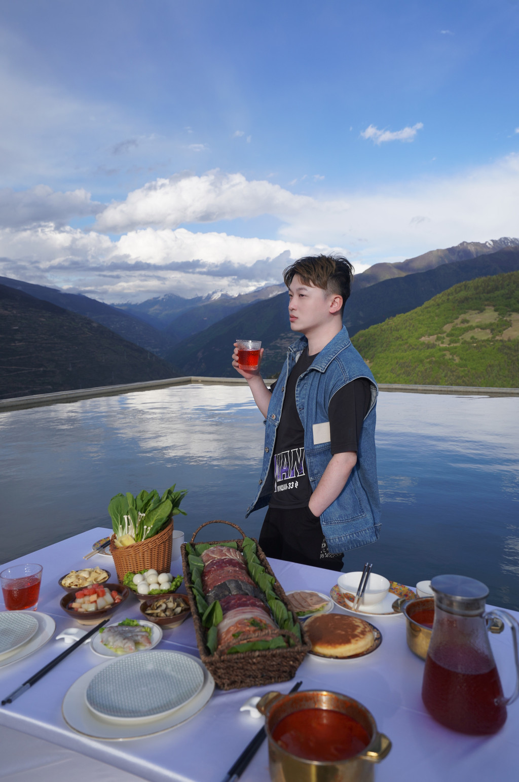 无边际观景池旁,铜锅里的牛骨汤翻滚得像岩浆。藏族厨师教我的吃法,先闷三口原汤,鲜味直接击中我的胃袋;再叉起牛筋蘸魔鬼辣碟,那种灼烧感,从舌尖一路窜到头皮;最后嚼入手掌参野菌,脆响在齿间炸开。邻桌的看我一个人吃了半盘辣卤牛蛙,笑着问:“小伙子,你胃里是不是装了熔炉?”