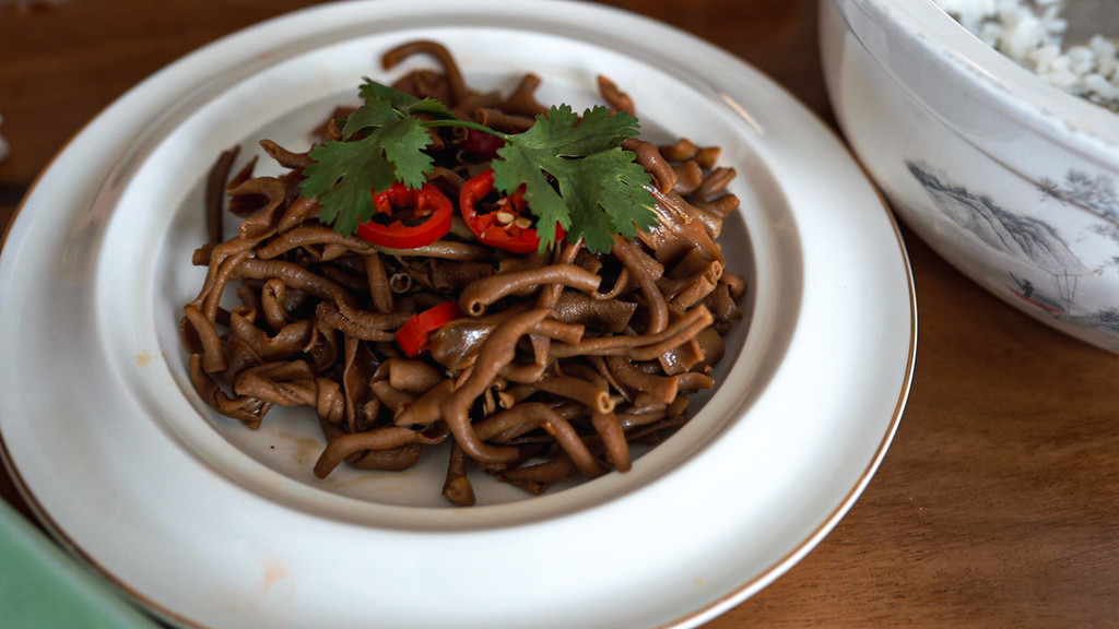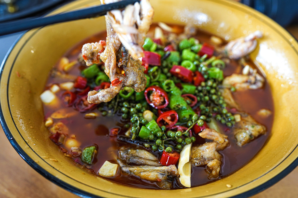 藏式辣碟(小米辣+腐乳+野韭菜酱)蘸牛杂,辣度堪比火山喷发。