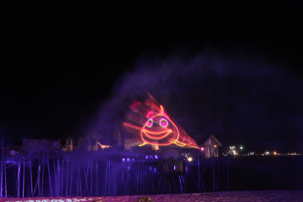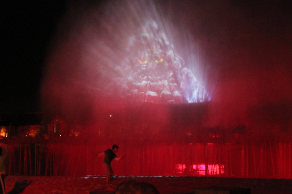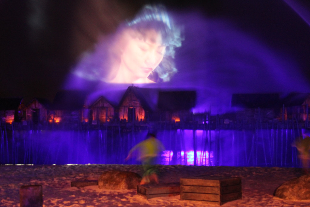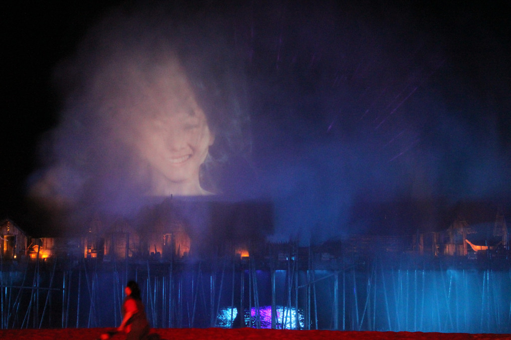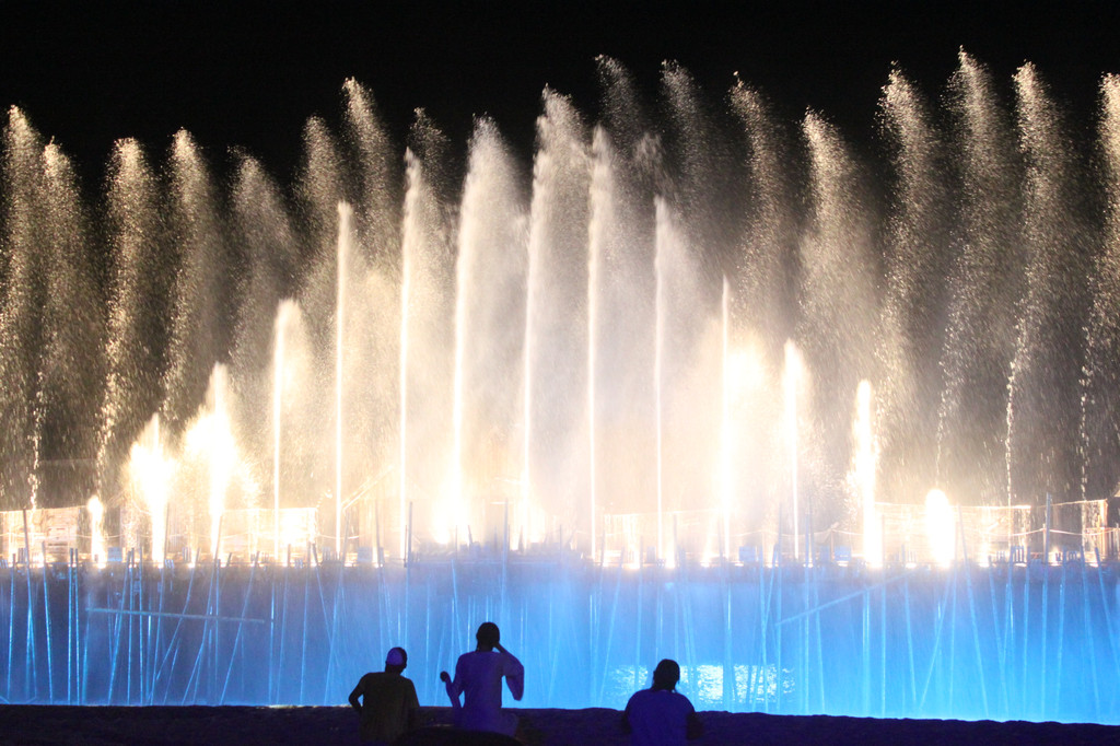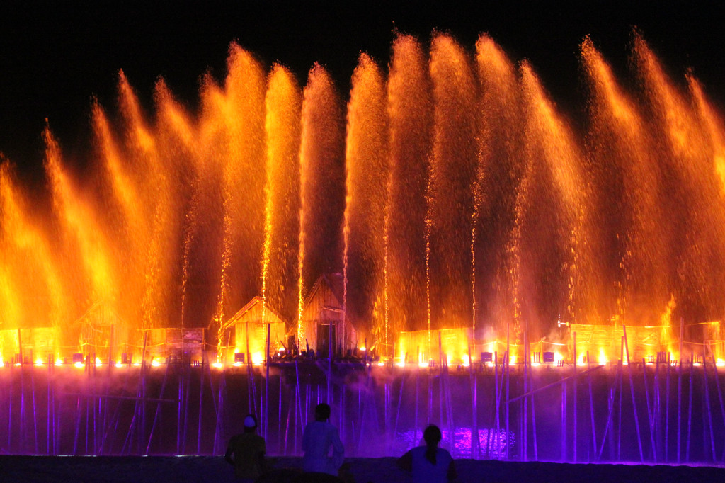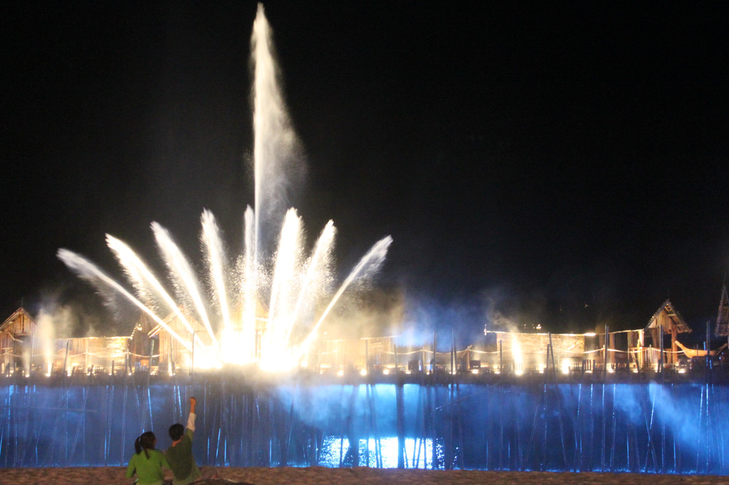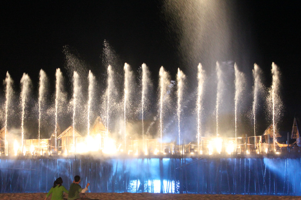 每当天色变黑,喷泉的水花就开始随着音乐和镭射光曼妙起舞,以水柱形成银幕,用镭射声光投射在上面,上演一出迷你剧情:一个名叫Lee的男孩生来一副好嗓子,当他和朋友们一起在海边放声歌唱的时候,海面上突然闪现出一个美丽少女的身影,但瞬间便消失得无影无踪。在小丑鱼和朋友们的帮助下,Lee了解了美丽少女的身世,他决心要解救被魔咒催眠的美丽少女。于是,他用歌声唤醒了海精灵,用歌声击退了魔鬼,最终用歌声再度迎来了微笑的少女。