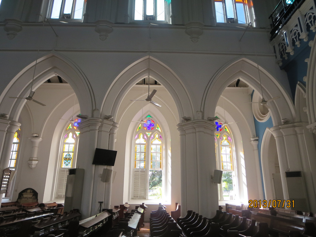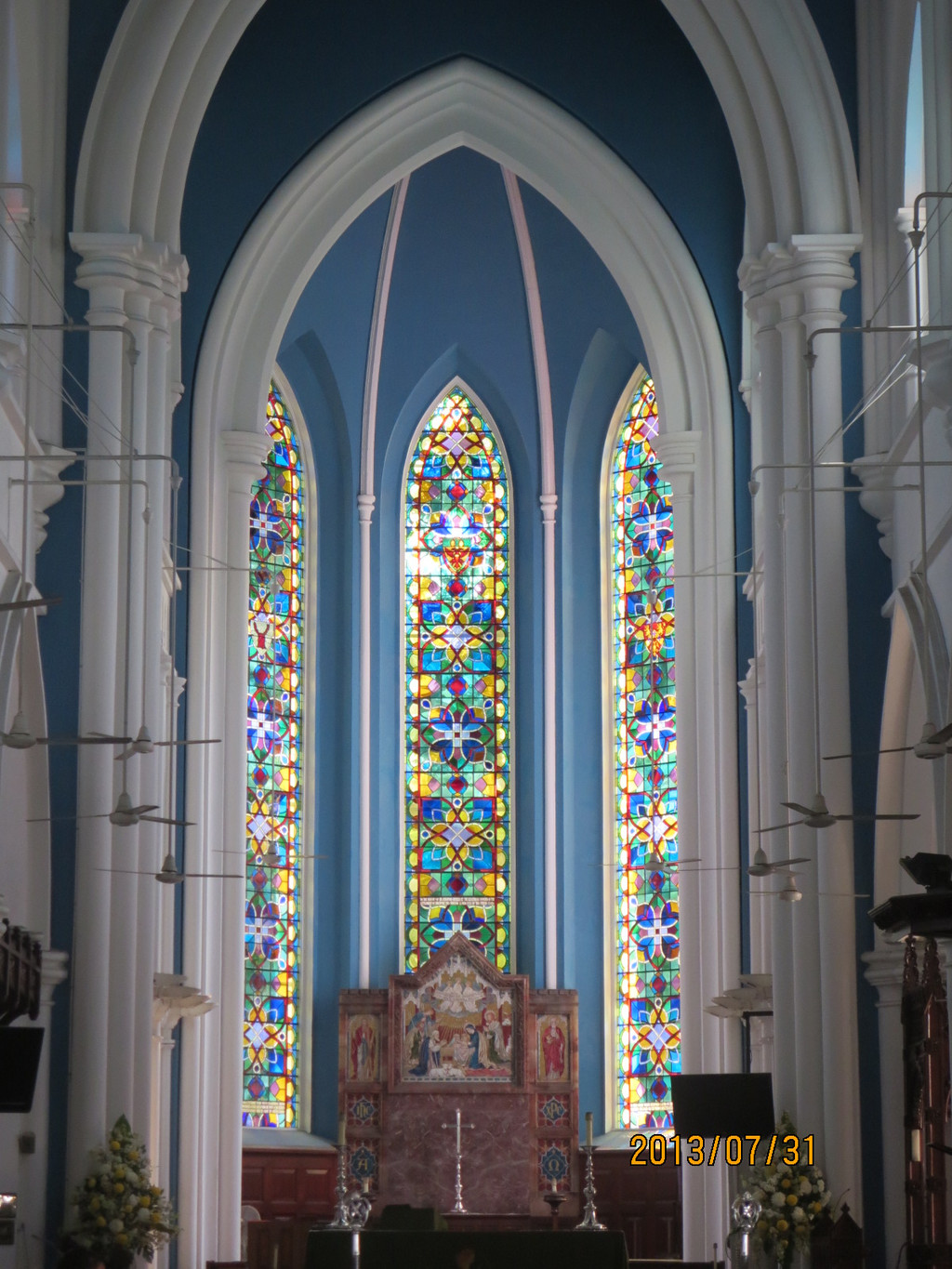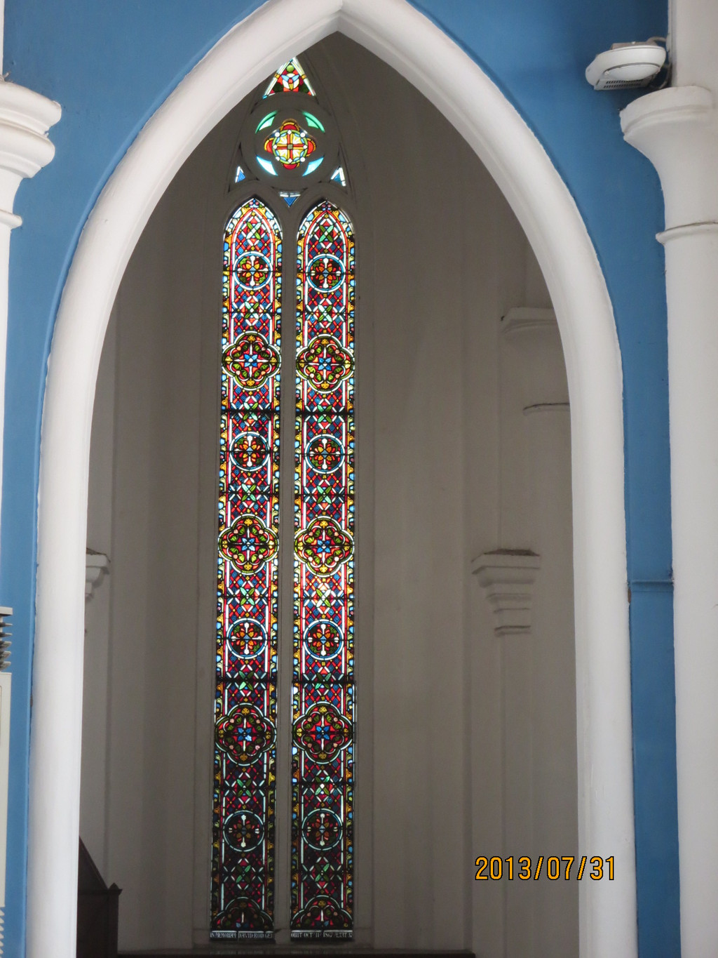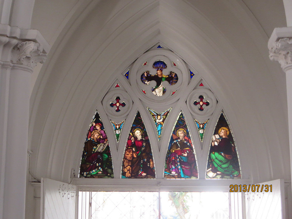 转向屏风之后,三面彩色玻璃窗将整个教堂的精美和华丽推向最高峰。透过每一小块细碎而又艳丽的彩色玻璃,阳光仿佛也被赋予了神的圣洁和美好,柔和地、华美地映射到大堂里。只要看上一眼,它就会把你的目光全部吸引过去,陷入那色彩缤纷的漩涡不能自拔,让人不由得久久地驻足。凝视着它,一时之间,好像思绪已经飞扬于万里之外、浮想联翩;又好像内心从未如此平静安详,隐隐仿佛听见管风琴和圣诗的悠扬旋律从天际传来。
