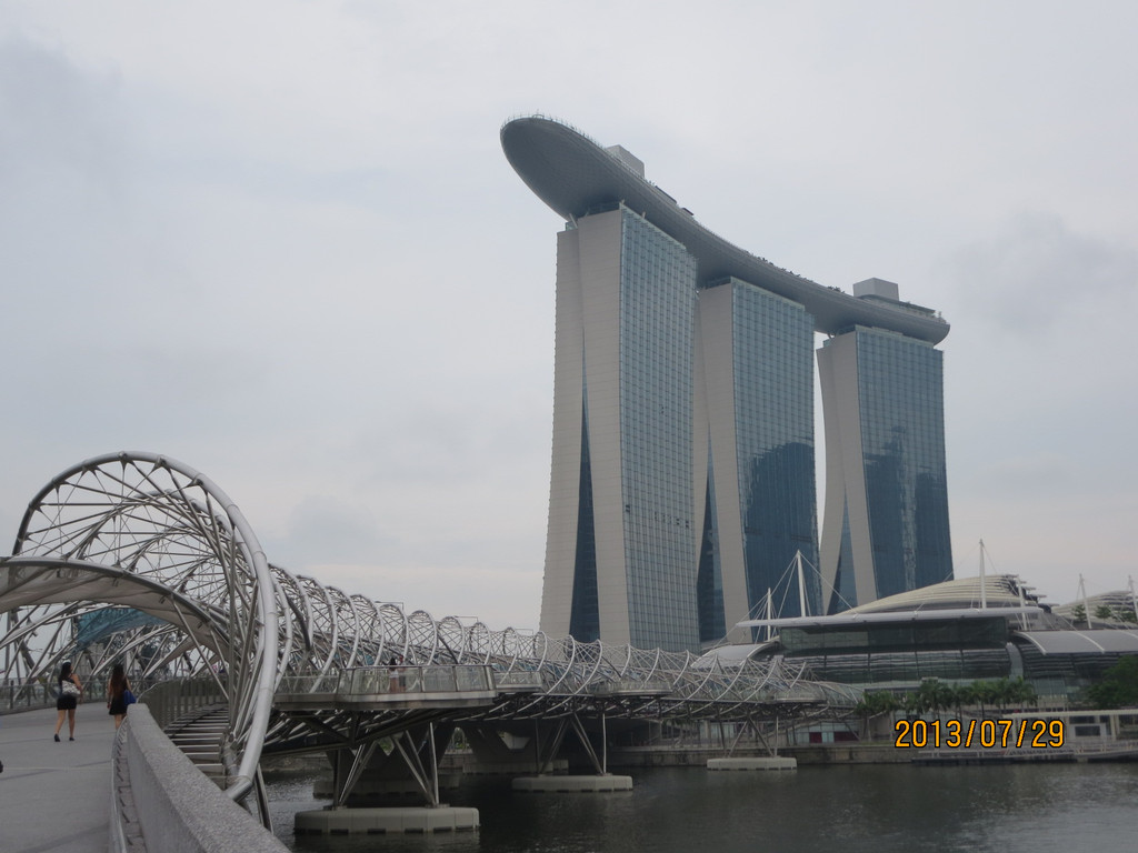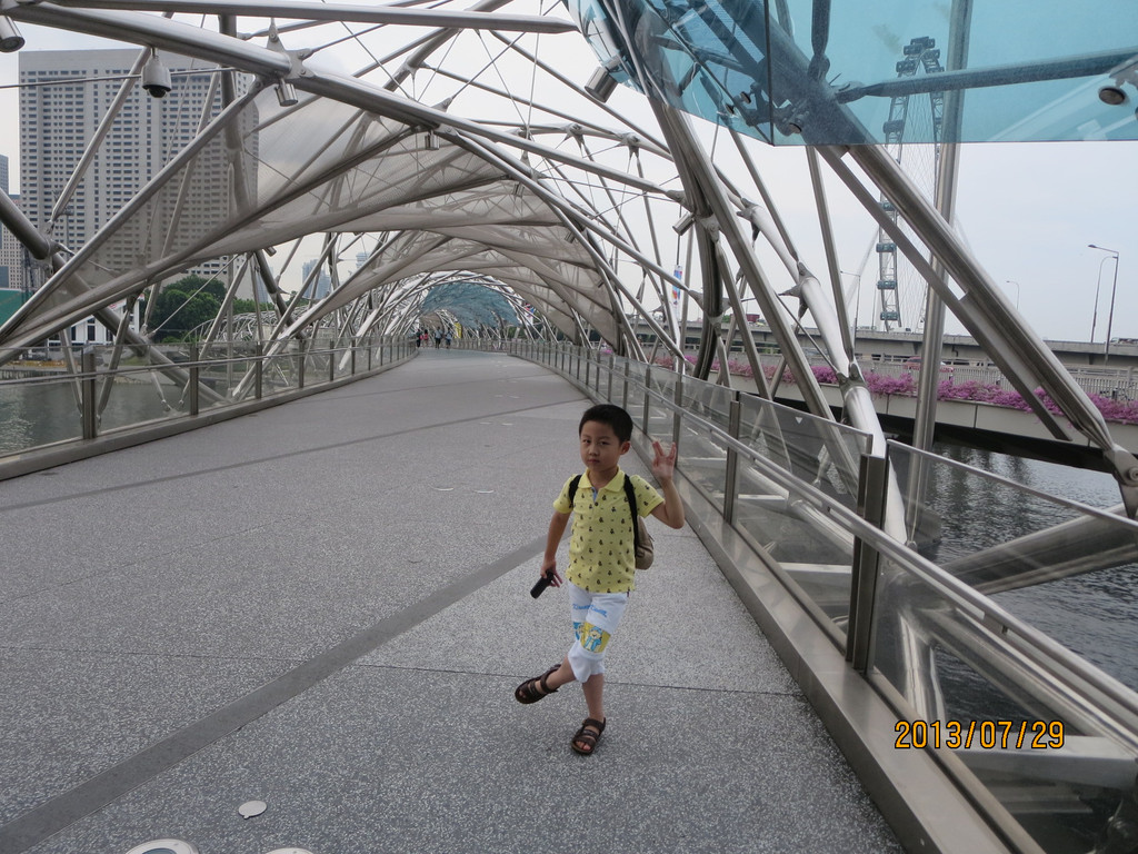 离大莲花不远处是又一座标志性建筑——双螺旋桥(Helix Bridge),这是世界上首座双螺旋人行桥,设计人员受DNA结构的启发,赋予这座桥梁 “生命与延续、更新与成长” 的体现意义。桥梁采用不锈钢钢管建造的两条螺旋曲线相互缠绕,盘旋形成长达280米的核心结构。桥面宽为6米,可同时容纳1.6万人。双螺旋中的内螺旋用于支撑遮阳的多孔玻璃和不锈钢网状天篷。不锈钢表面可产生绚丽的夜晚照明效果,因为它们能反射桥体中内置的、用于增强设计美感的特殊灯具的光线。桥上设有可让行人休息或眺望市景的圆形瞭望台,这里也是水上运动和烟花表演的最佳观景台。无论是从桥面,还是从五个观景平台望去,螺旋桥都使这个城市的天际线更加壮观。