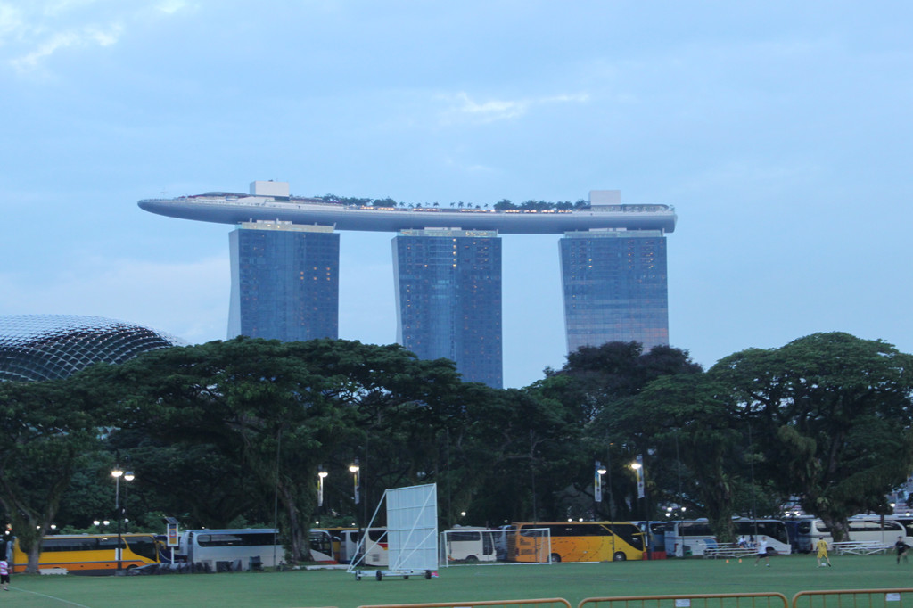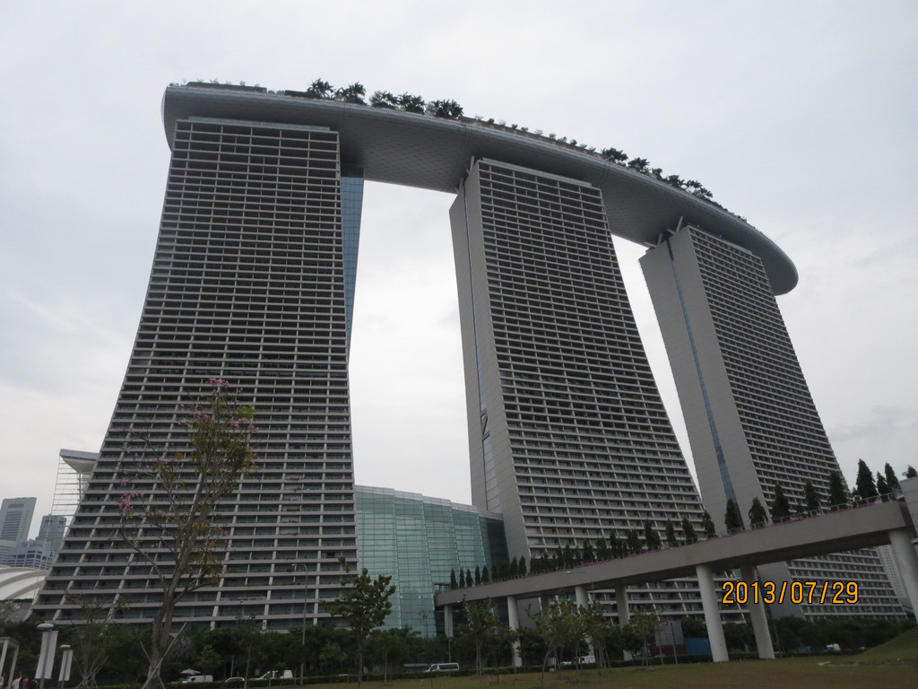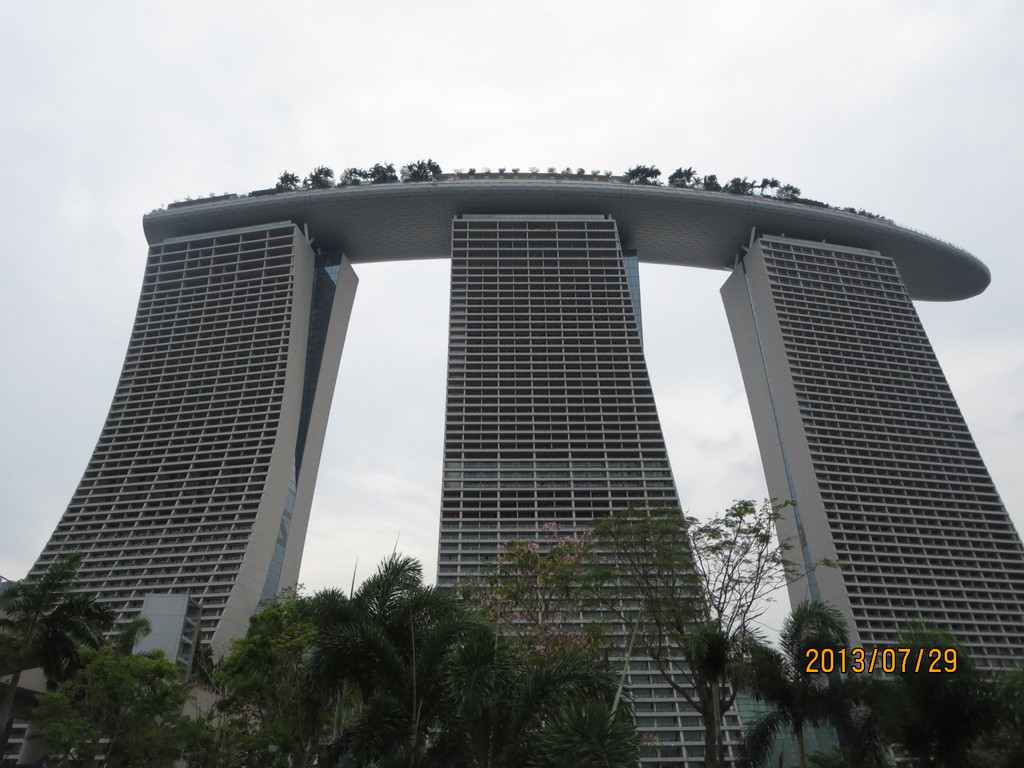 从酒店出来走不多久,就能远远望见大名鼎鼎的标志性建筑——金沙酒店。其顶部将三座大楼连为一体的空中花园形似一艘昂首起航的飞船,远看更有气势,果然百闻不如一见。