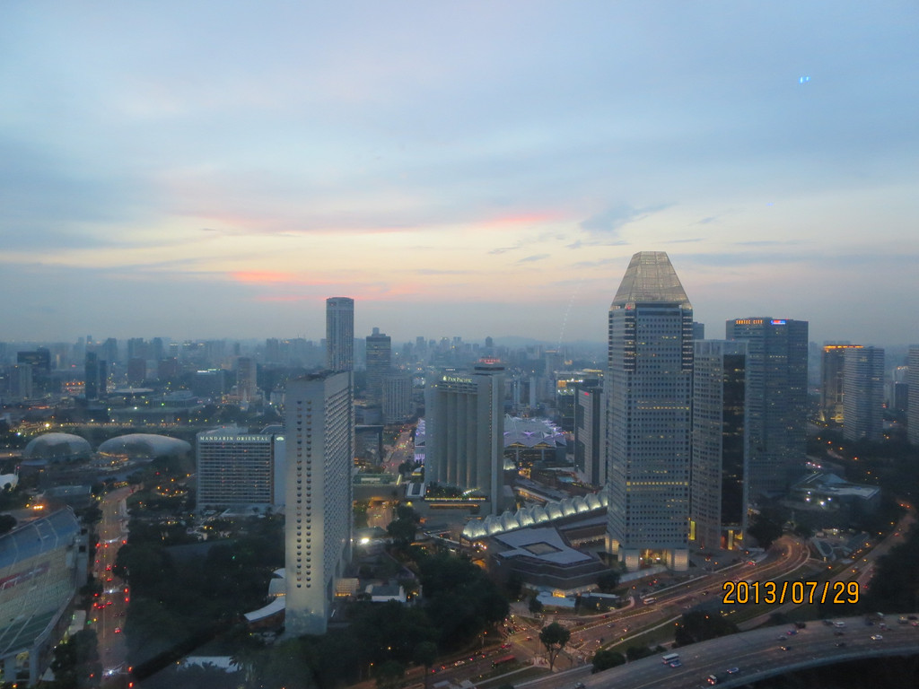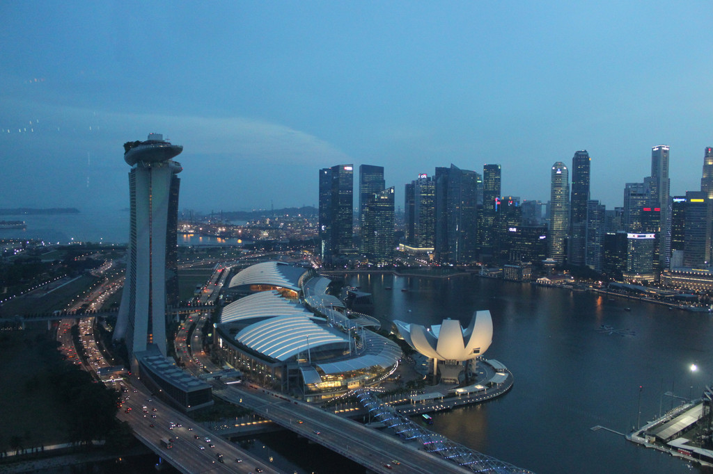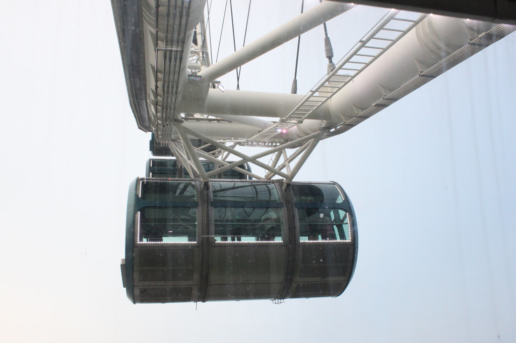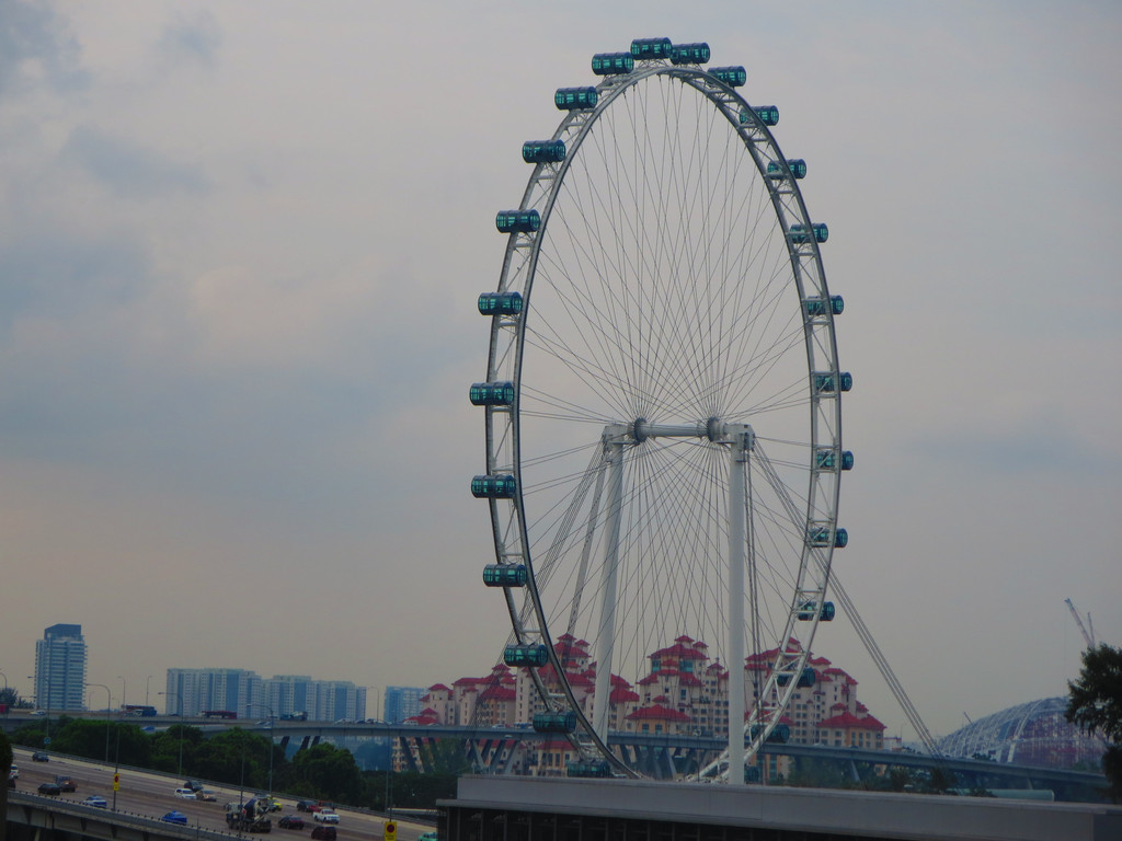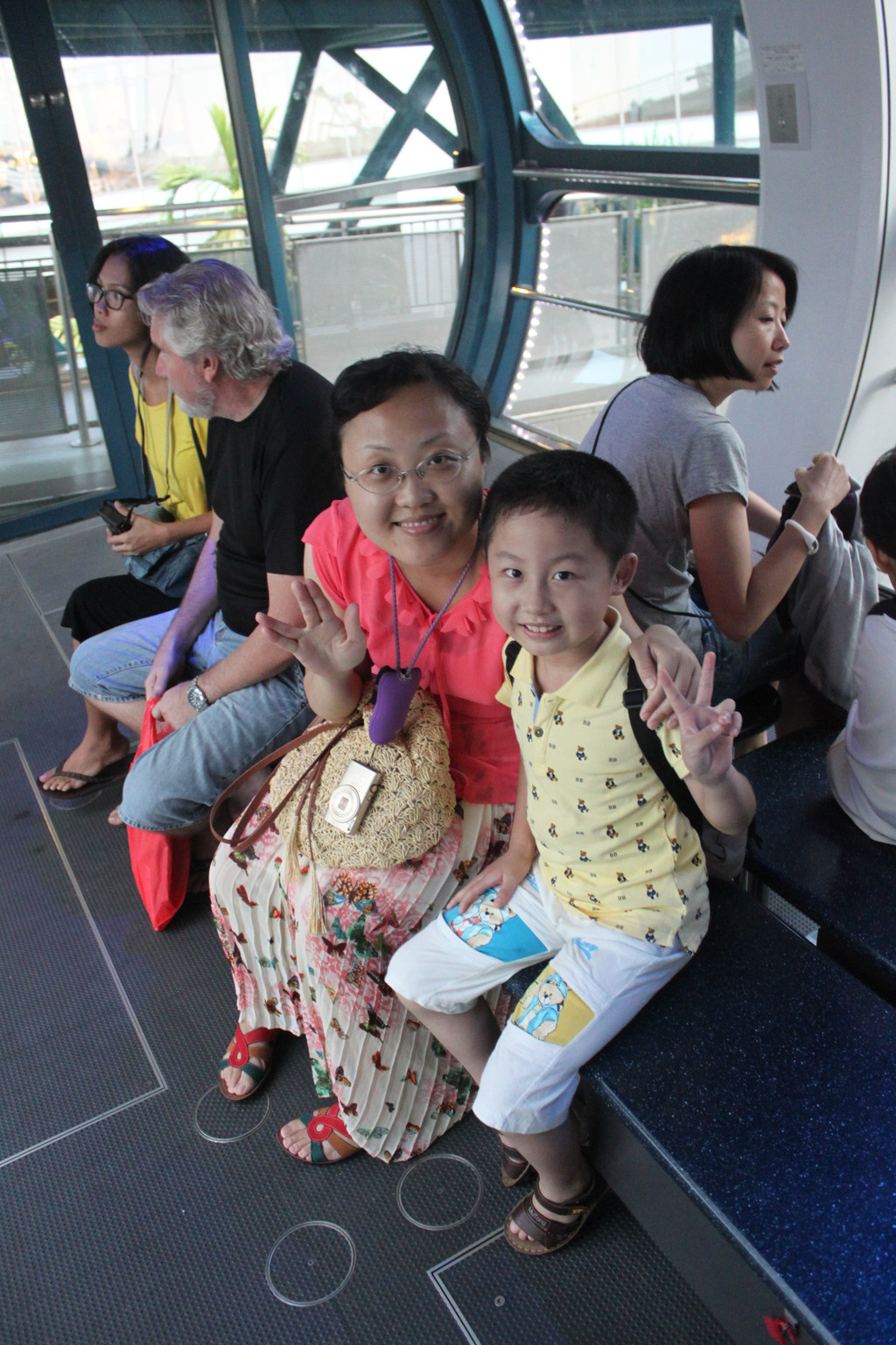 这么早吃好晚饭就是为了赶在太阳落山前登上新加坡观景摩天轮(Singapore Flyer),这样就能在摩天轮上一路欣赏夕阳西下到华灯初上再到夜景璀璨。这个巨型摩天轮共有28个观光客舱,高达165米,相当于42层楼高,比英国伦敦的“千禧眼”还要高30米。