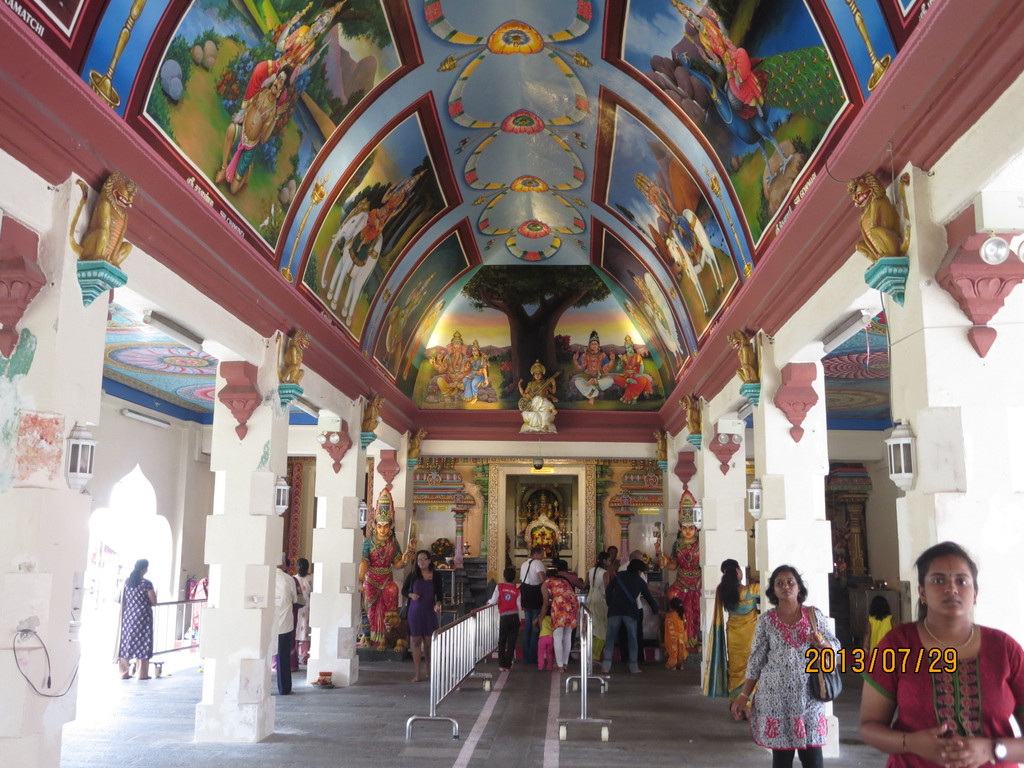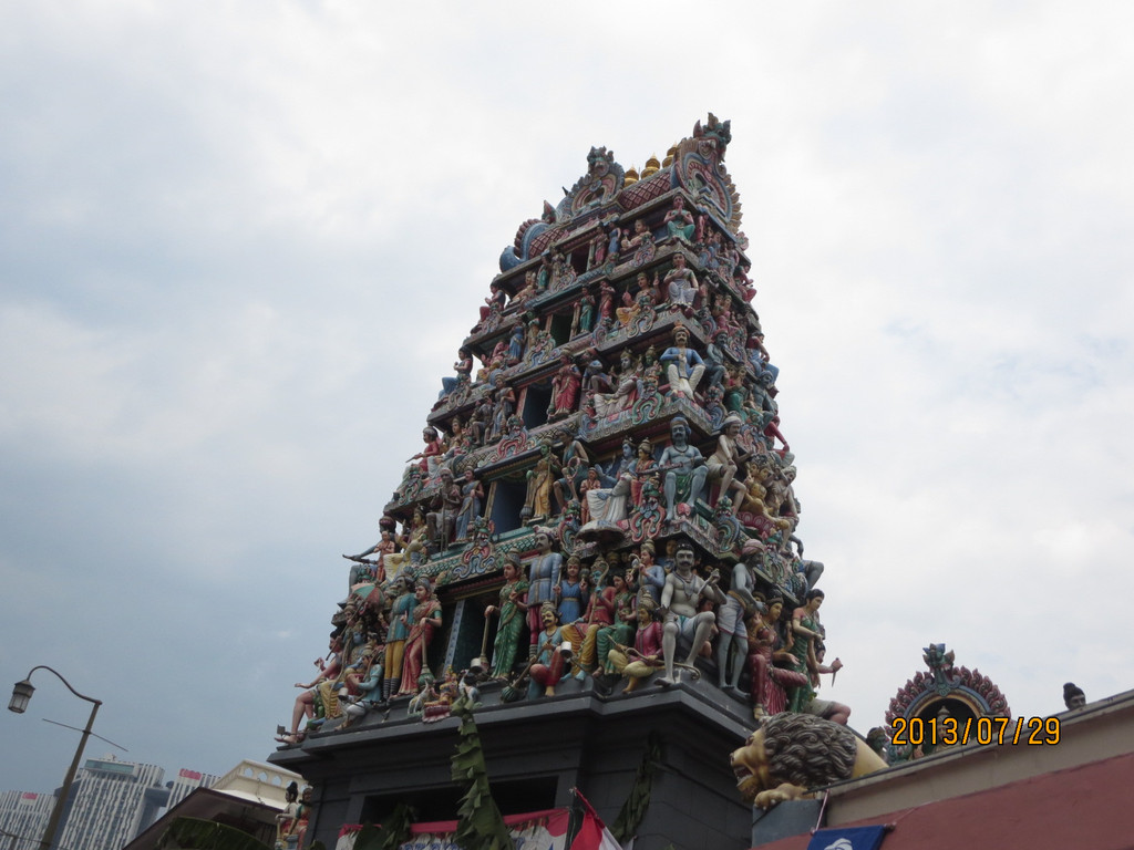 寺庙大门上雕刻着色彩艳丽的印度教诸神、动物、人物等,给牛车水这个华人聚居区增添了一种别样的宗教气氛。而门内的高塔上,有各种神灵和圣兽栩栩如生的雕像,离得很远都能看到。