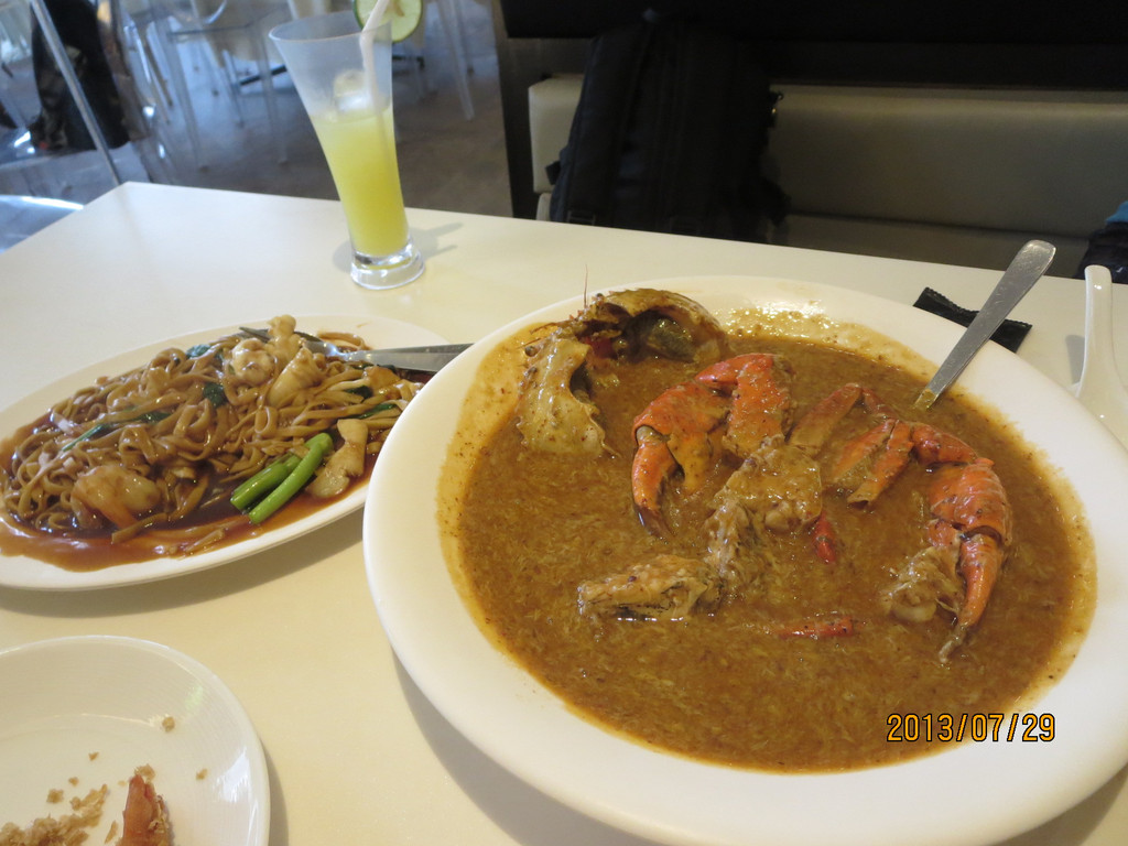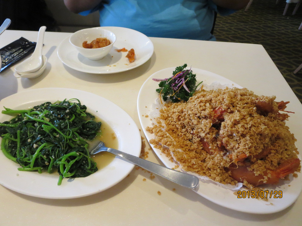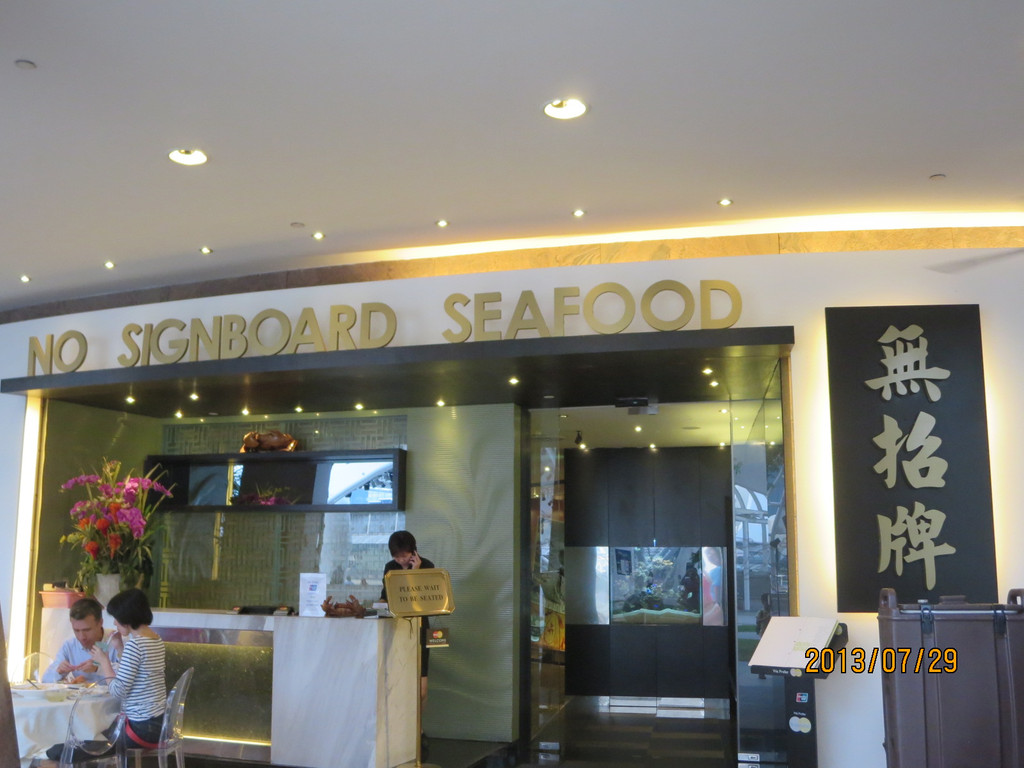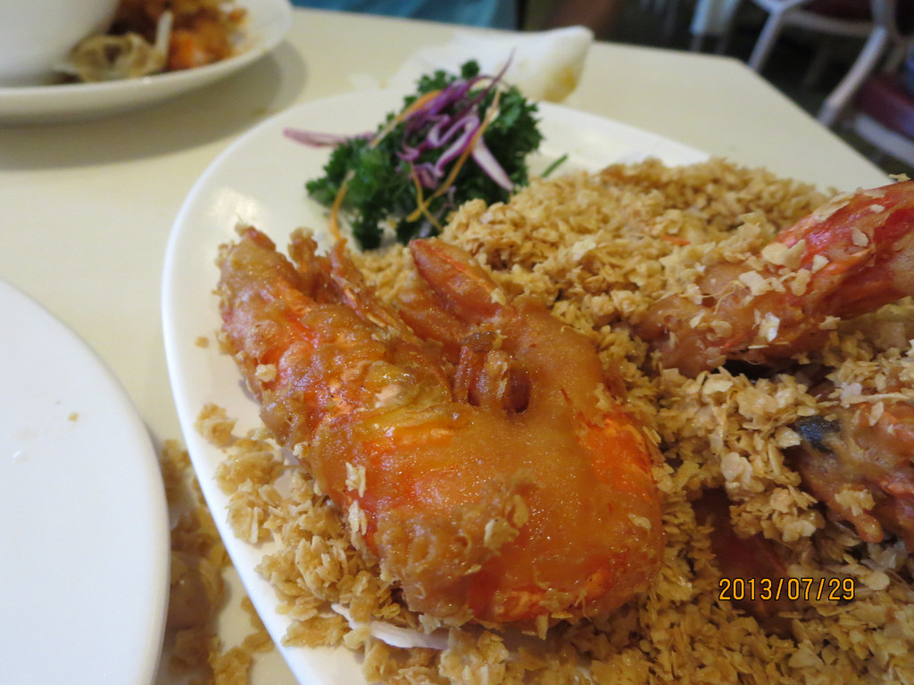 沿着河边的人行步道,我们踱到了无招牌海鲜店(No Signboard Seafood)。这是一家很出名的新加坡海鲜老店,餐厅名称来自于顾客的奇思妙想。餐厅创立于1981年,现在已经凭借其原创新颖的菜式而蜚声全岛。招牌辣椒螃蟹是新加坡最著名的国菜,也可称之为国宝。辣椒螃蟹是以辣椒和螃蟹为主要食材做成的一道菜品,其实并不是很辣,味道酸甜,甜中带辣,螃蟹更是保留了鲜嫩的口感。辣椒螃蟹跟国内的香辣蟹相比,虽然没有香辣蟹那么麻辣鲜香,但因为保留了螃蟹的原汁原味而更胜一筹。吃完螃蟹,一定记得再配上一份黄金小馒头,蘸上用辣椒酱和蟹黄熬成的浓香酱汁,舌尖上的鲜美会让人回味无穷。小家伙就因为这道辣椒螃蟹而爱上了小馒头,多年以后仍念念不忘。而我也忘不了辣椒螃蟹的美味,多年以后在上海的珍宝海鲜餐厅又特地点了这道菜。除了辣椒螃蟹,无招牌的脆皮麦香虾也是热门之选。鲜嫩多汁的大虾与麦香味谷物相搭配,更兼具宜人的酥脆口感。