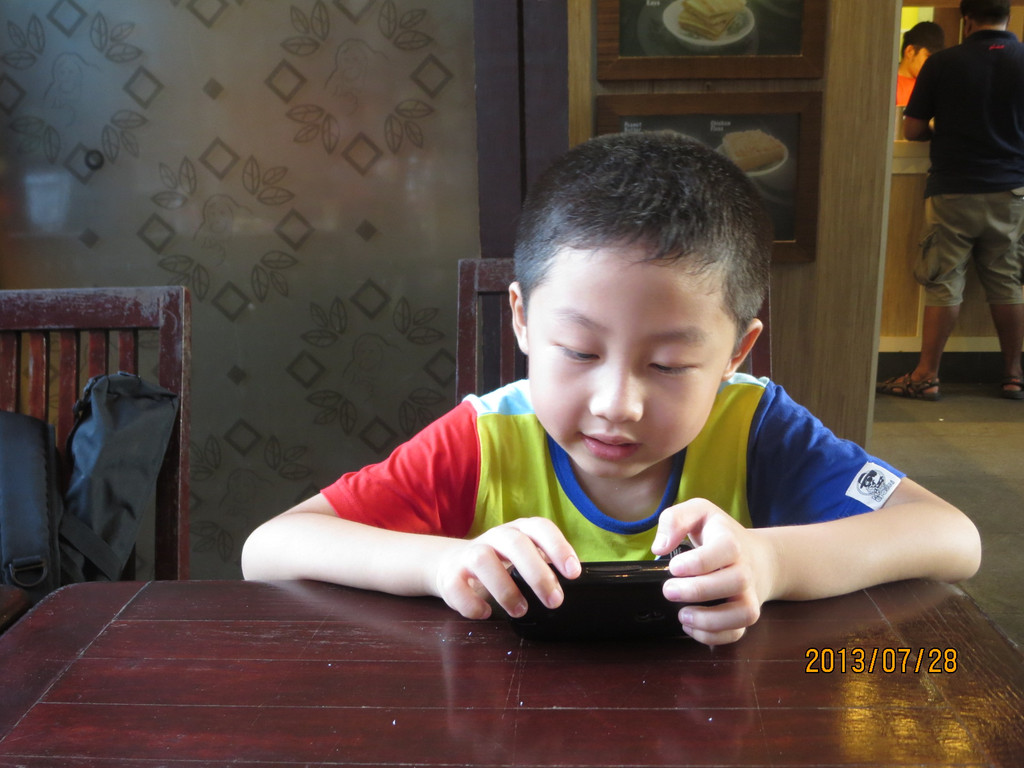 顺利抵达浦东机场后,小家伙并没对眼前庞大雄伟的机场候机楼表现出应有的热情,仍一如既往地跑前跑后,平地跑还不算,在传送电梯上照样跑得兴致盎然。带着这么个精力过剩的小家伙去排队check in、出关、过安检,老母亲被折腾得够呛。没有了供他任意驰骋的广阔天地,他就开始上蹿下跳地往纵向发展空间了。一忽儿站上了行李传送带,一忽儿在地上捡个小纸片,层出不穷的小动作让两个大人防不胜防。他小人家嘴还不闲着,不停地追问还要等多久,什么时候才能上飞机等等。百般无奈之下,只得把我的手机扔给他玩游戏,总算消停下来,整个世界清静了。
