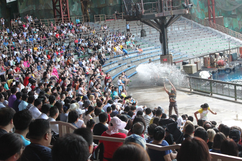 看看这摩托艇旋出的冲天波浪,坐在前排的观众可就妥妥地“湿身”了。