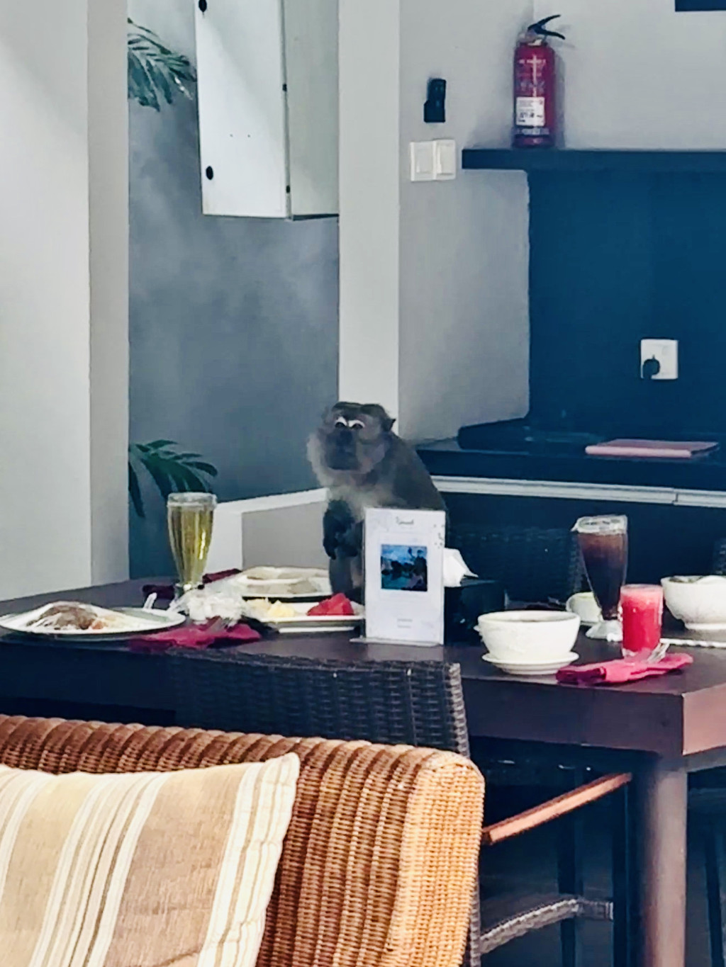 生态环境很棒,早上小猴子来客厅偷吃水果。