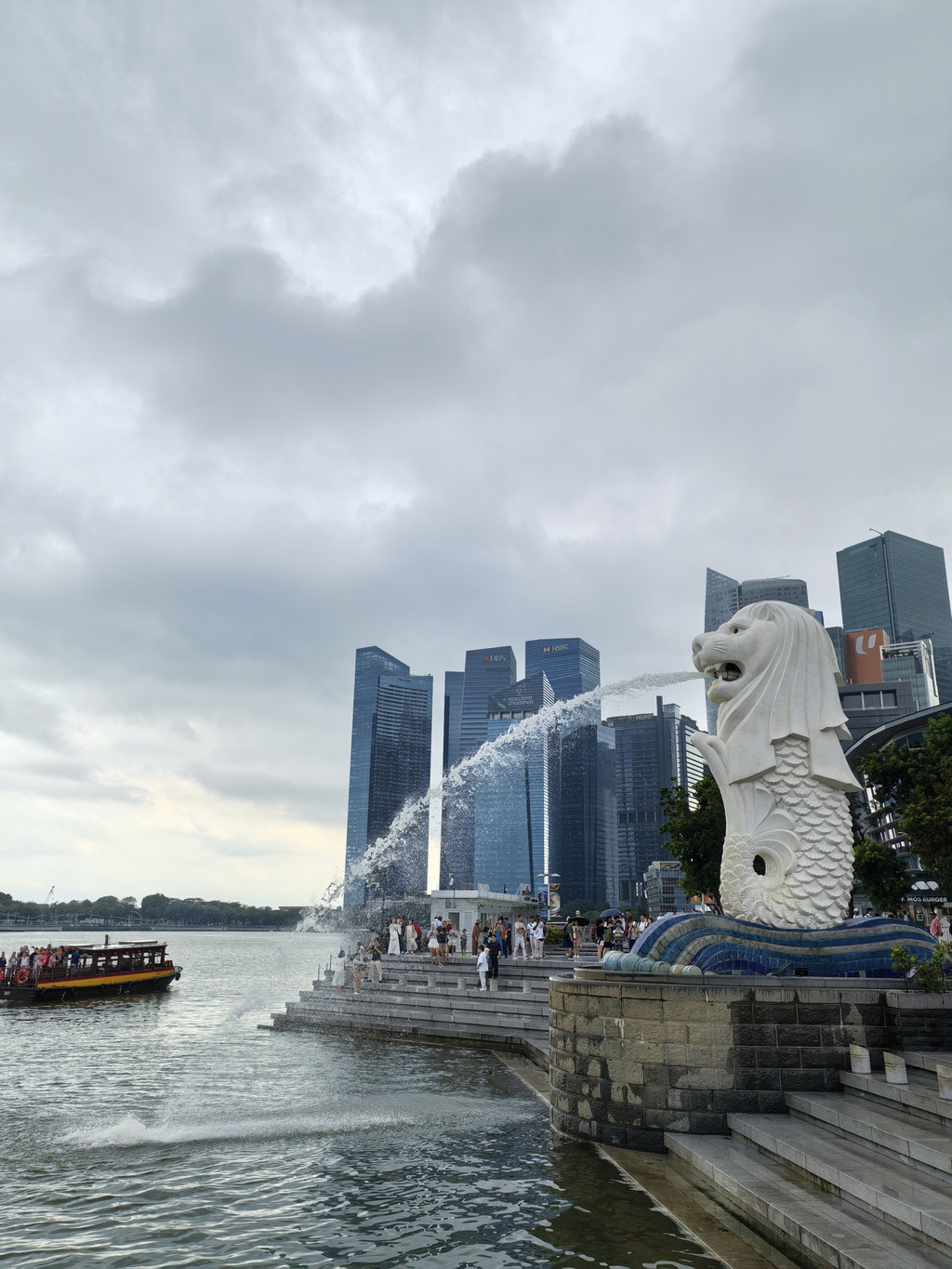 随后我们去看了新加坡的标志性建筑鱼尾狮喷泉,热带气候的大雨说来就来,走出国立美术馆,湿湿的地面是大雨冲刷后的凭证。可能是因为在雨后,喷泉附近的人并不多。鱼尾狮喷泉背后高楼林立,昔日亚洲四小龙的辉煌壮阔也记录在这里。