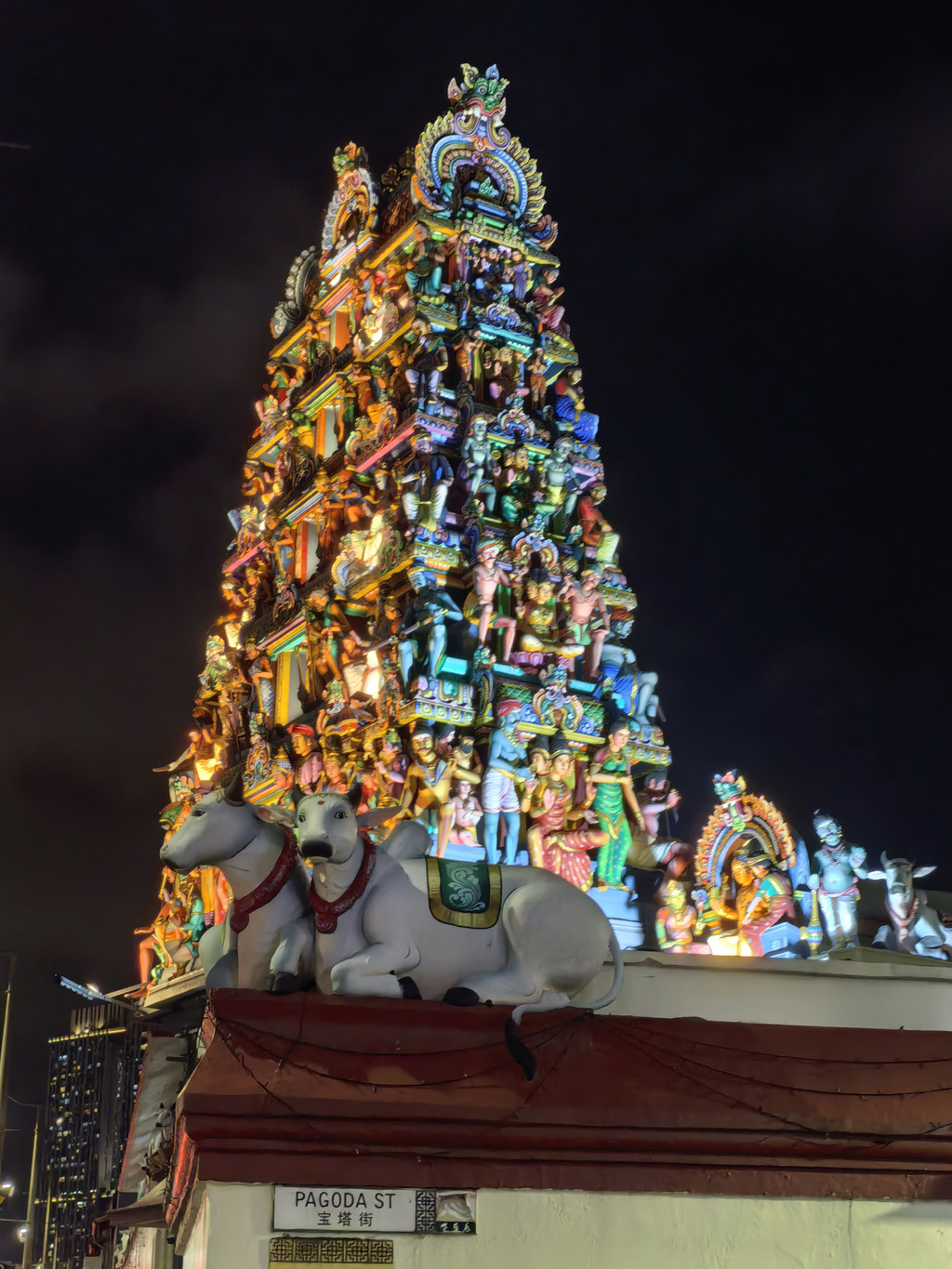 晚上,我们跑去牛车水Chinatown附近吃完饭,临近地铁站的一条充满烟火气的“菜市场”里(形容不出来这条破烂的小吃街),有许多家鲜榨水果汁和一家非常脆非常香的炸馄饨。炸馄饨顾名思义就是将我们国内煮的薄皮肉馅小馄饨下锅用热油炸的焦香酥脆。还有类似沙茶面的叻沙面,吃完后同样口齿留香。在附近走走,能看到许多宗教场所,唐人街周边的路口有一座马里安曼兴都庙,宗教的虔诚与神秘都在书写在静默的建筑里。附近也有很多售卖新加坡特产、新加坡纪念品的小商店。