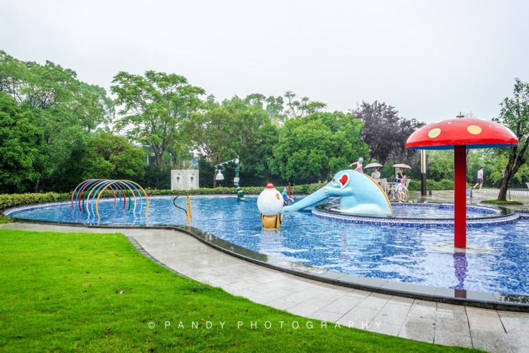 穿过水上石板路就来到了酒店的室外泳池区域,这里总共有大小不同的三个泳池,其中一个是儿童池,还有一个类似无边际泳池。