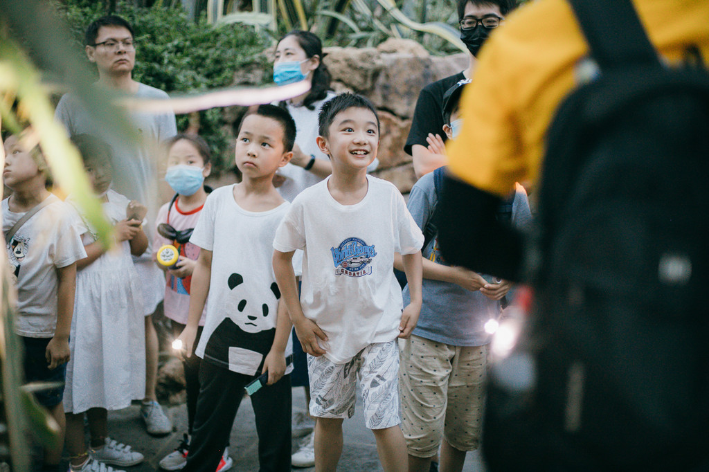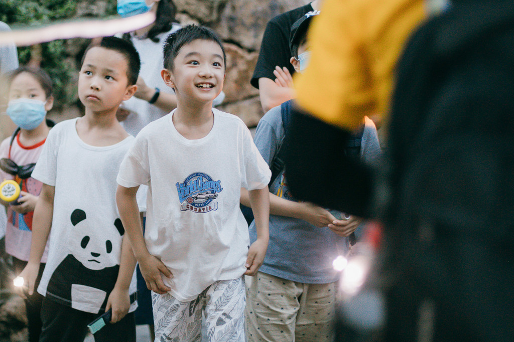 夜游活动下午6点半开始,需要在上海辰山植物园的2号门先集合,在空阔人少的地方可以摘下口罩放松一会儿,不过8月初的上海即使到了傍晚也是十分炎热的,这个时候也要注意小朋友的状态,汉堡挺激动的,所以状态很好。
