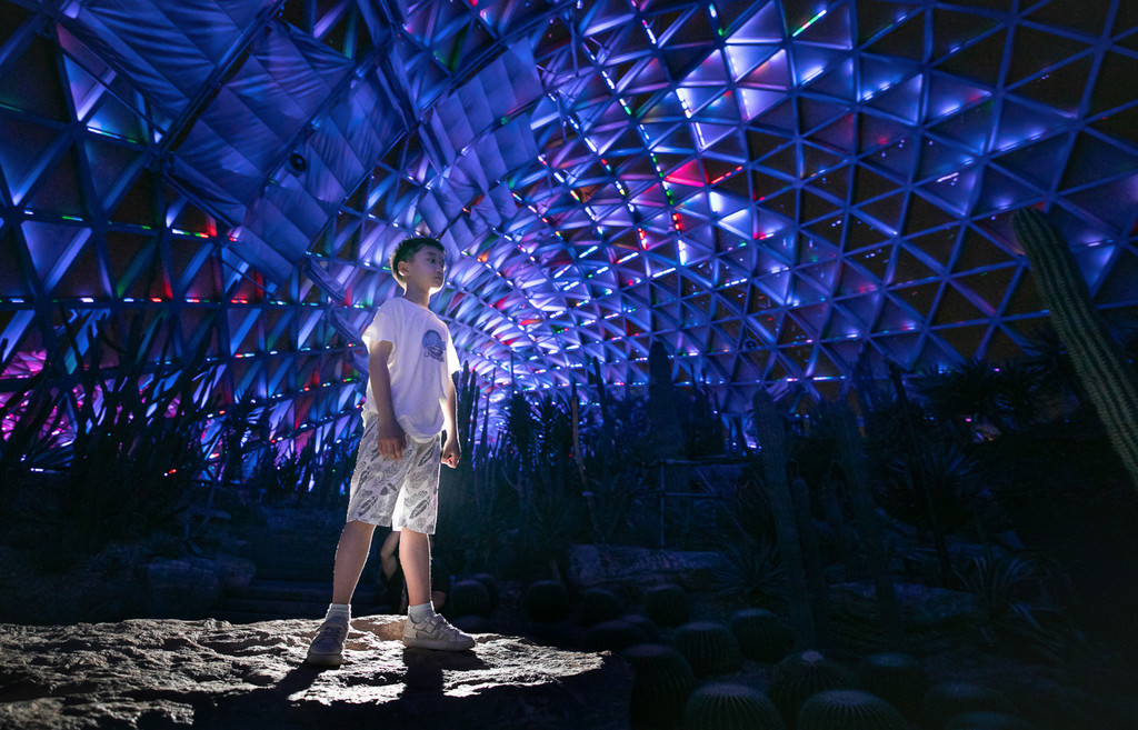 夜游植物园开始了,家长和小朋友们跟随导游们鱼贯进入温室馆,去见证那些奇特的生命世界,和那些未知的万事万物。展馆里的植物都是平常很难得才能见到的,比如镇馆之宝百岁兰,比如巨大的仙人球,小朋友们睁大好奇的双眼,不肯放过一点点新鲜。