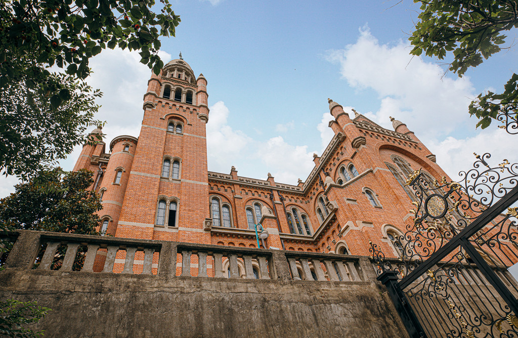虽然不能进入教堂内部参观,但宏大雄伟的外观也非常棒。哥特式的尖顶、以色列式的橄榄形钟楼、西班牙式的小圆顶、还有希腊式的廊柱,但琉璃瓦和清水壁又是中式风格,多样的文化融合出了不一样的风采,让天主教堂显得如此不一般。