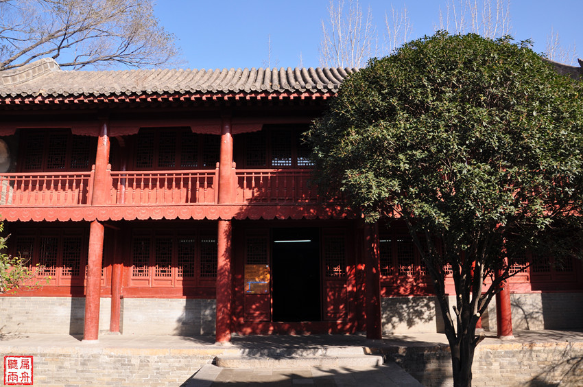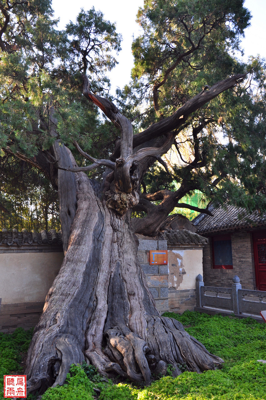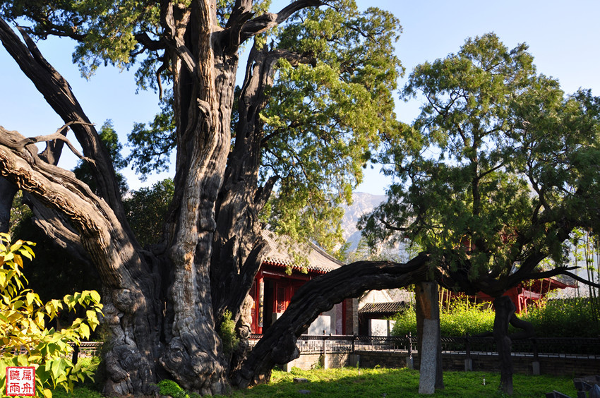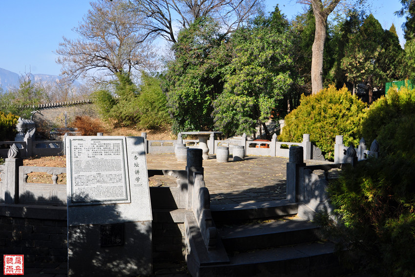 御碑亭左侧那棵由一架长梯支撑保护的古槐,据传是北宋神宗熙宁年间“二程”在此讲学时亲手栽植,树高19.5米,围粗4米。