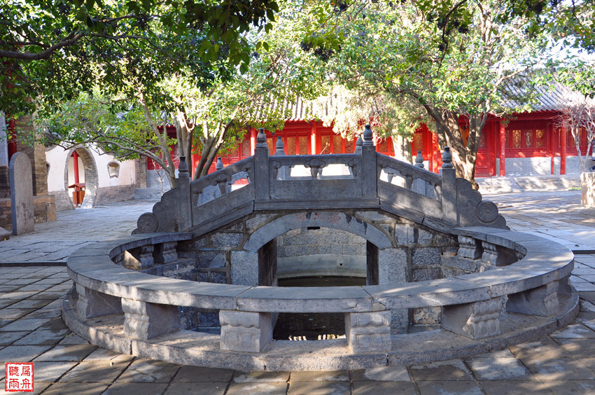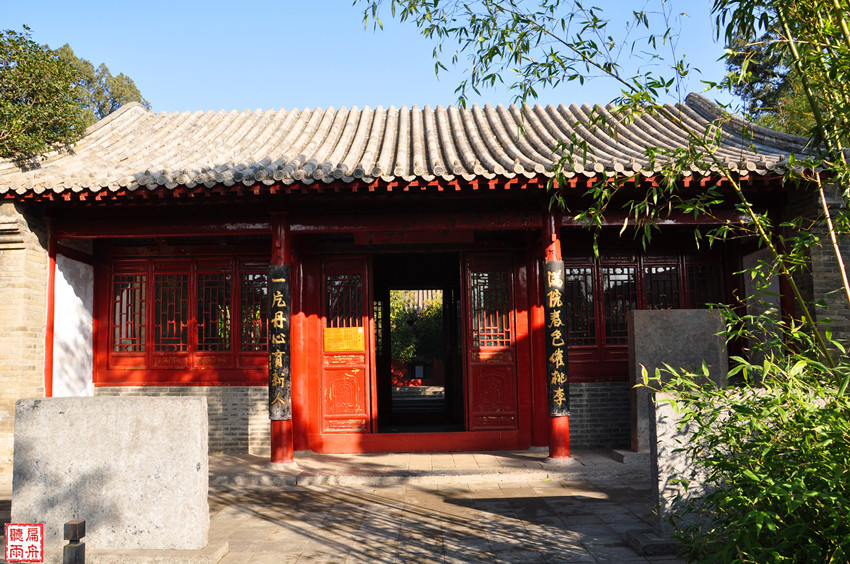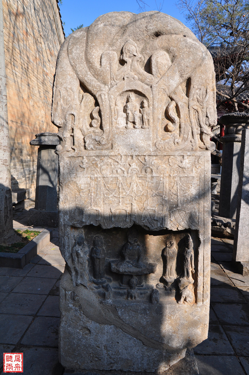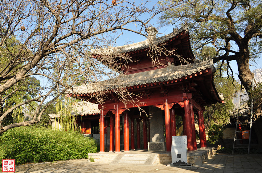 走过高山仰止牌坊,进入第一进院落,中线东侧是一座四角飞檐的碑亭,碑亭里有宝藏级的中岳嵩阳寺伦统碑。此碑是嵩阳寺的出生证明,东魏孝静帝天平二年(535年)刻立。石碑一面镌刻94窟佛像,另一面上部刻大佛龛,内作一佛二菩萨三弟子,龛楣浮雕的飞天童子诸像及碑侧图案,颇为精致,为中原石刻艺术中的上乘之作。