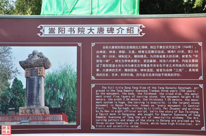 杏坛向北再步上一层阶梯,有号称中原第一碑的“大唐嵩阳观纪圣德盛应之颂碑”。大唐碑高9.02米,宽2.04米,厚1.05米,大唐碑重80多吨,仅碑帽就有10多吨重,唐天宝三年(公元744年)刻立。碑文计1078字,内容主要叙述嵩阳观道士孙太冲为唐玄宗李隆基炼丹九转的故事。碑文由李林甫撰写,裴迥篆额徐浩的八分隶书,是唐代隶书的代表作品。参观期间,正值修缮维护,未能见其真容。