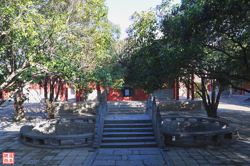 沿中线走上一层梯级台阶,西侧是在遗址上复原的杏坛。清初,中州著名学者耿介遵循孔子杏坛讲学的传统,在此辟地为坛。当年,坛上有古杏树一株,传为耿介手植,现已无存。
