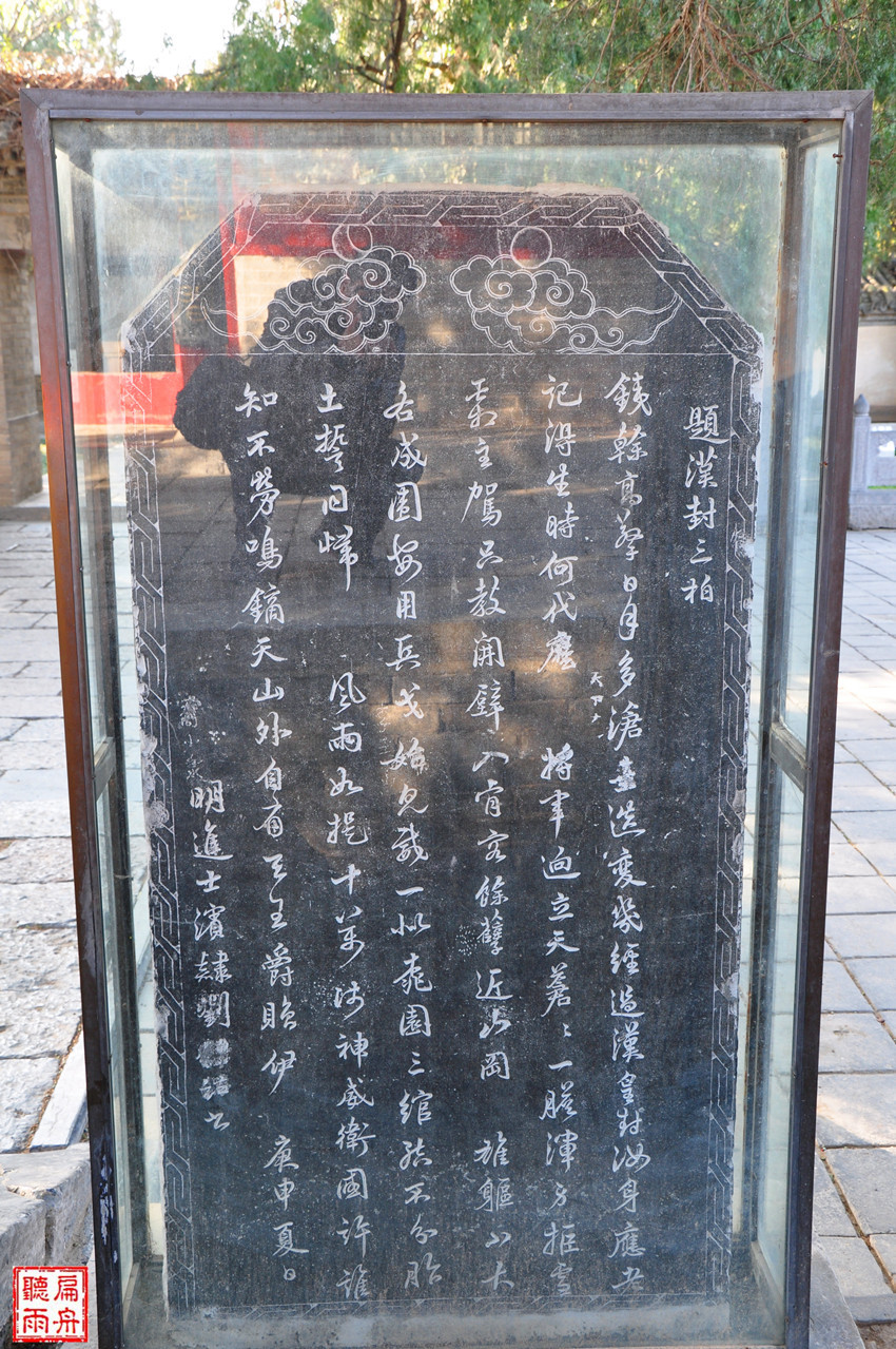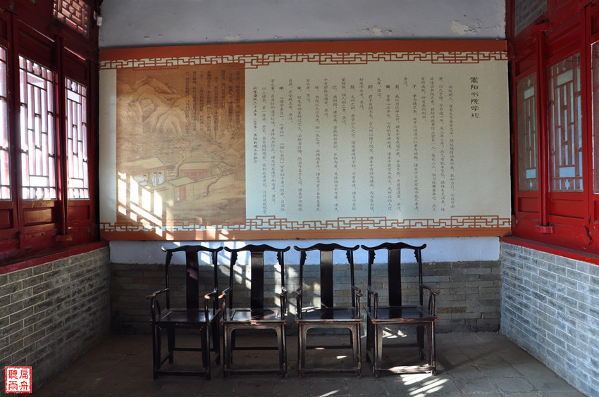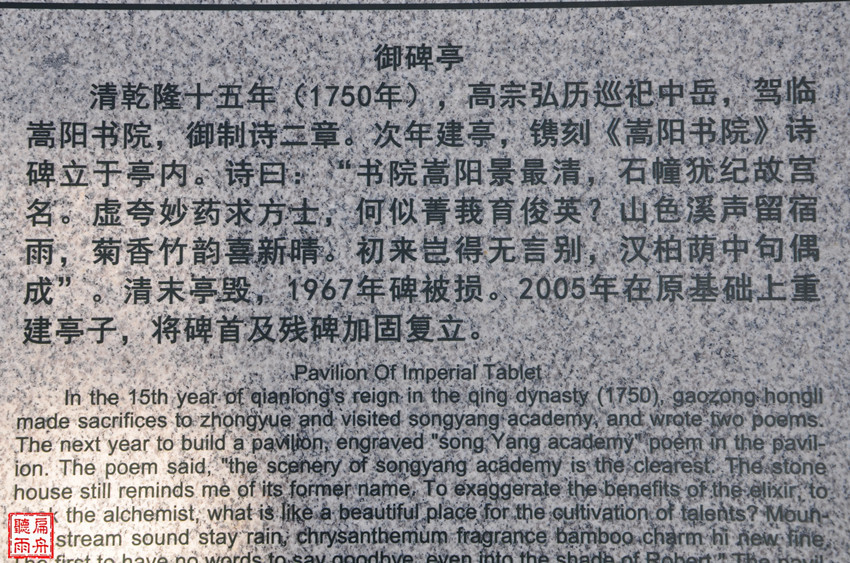 先贤殿的东侧有御碑亭一座。当年,乾隆皇帝巡游嵩山,曾写下两首诗,时人于第二年将皇帝的诗刻于碑上,并修亭予以保护。碑上的诗句是:“书院嵩阳景最清,石幢犹记故宫名。虚夸妙药求方士,何似菁莪育俊英。山色溪声留宿雨,菊香竹韵喜新晴。初来岂得无言别,汉柏阴中句偶成。”对嵩阳书院极尽赞美。