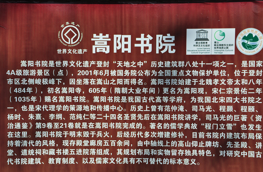 嵩阳书院和应天书院(今河南商丘睢阳南湖畔)、岳麓书院(今湖南长沙岳麓山)、白鹿洞书院(今江西九江庐山)并称中国古代四大书院。现在则是世界文化遗产天地之中古建筑群的重要组成部分。